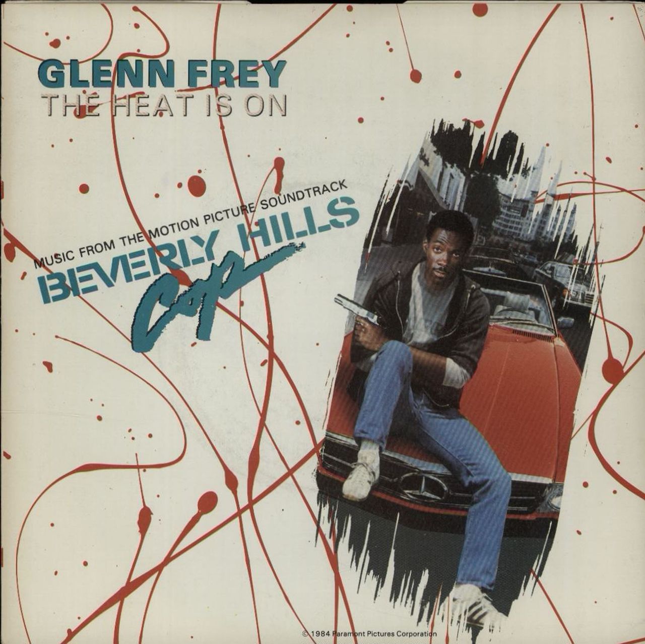 GLENN FREY The Heat Is On (1984 UK 7" vinyl single taken from the 'Beverly Hills Cop' movie soundtrack, also including Shoot Out, Eddie Murphy picture sleeve. The sleeve & vinyl remain in Excellent condition MCA941)