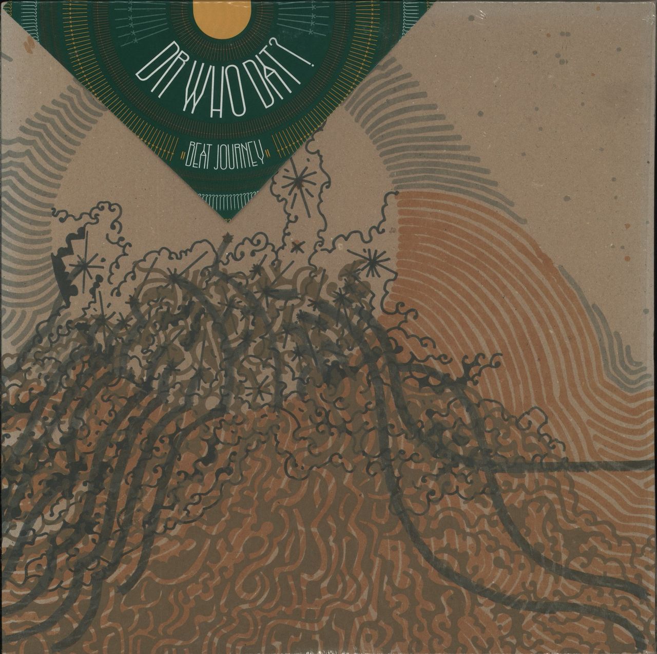 DR. WHO DAT? Beat Journey (2006 UK 18-track double vinyl LP. Debut album from the hip hop music producer, composer and DJ. Single pocket picture sleeve with die-cut printed inners. The sleeve remains in the open title stickered shrink and shows just a little edge fading from age. The vinyl show only light signs of play. LEX039LP )