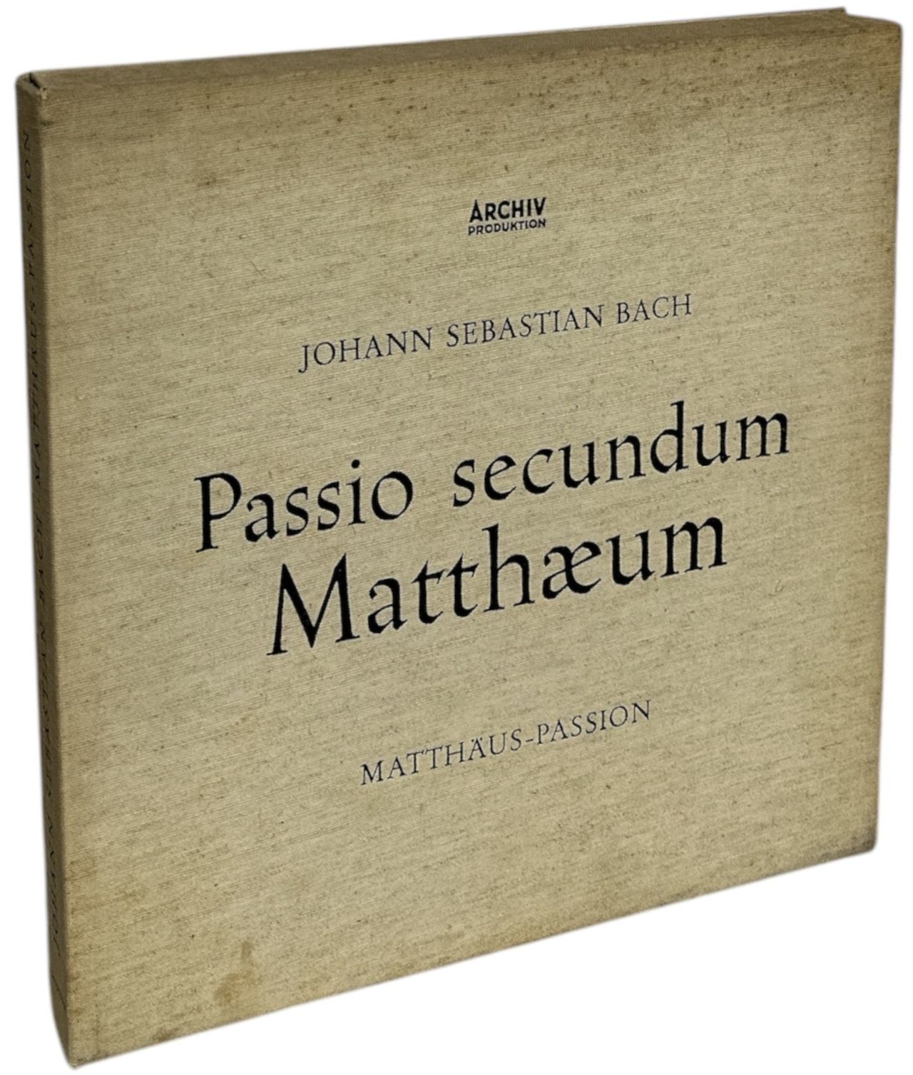 KARL RICHTER conducts the MUNCHENER BACH ORCHESTRA Bach: Passio Secundum Matthæum (Matthäus-Passion) (1958 German 79-track 4-LP vinyl set, fabric-bound box set with 36-page libretto booket. The box shows foxing, whilst the vinyl is Excellent with minimal sign of play)