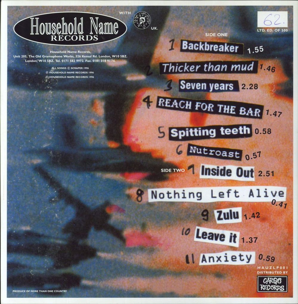 SCRAPER Built With Hate (1996 UK 11-track 10" album, pressed on Blue Vinyl. Stand alone debut album from the Birmingham punk band. Hand-numbered wrap-around sleeve with pasted inner. The sleeve has some paper loss to the inside, due to sticking to the print on the inner; the inner has some paper remnants. The vinyl is in Near Mint condition ***Limited to only 500 copies*** HAUZLP001)