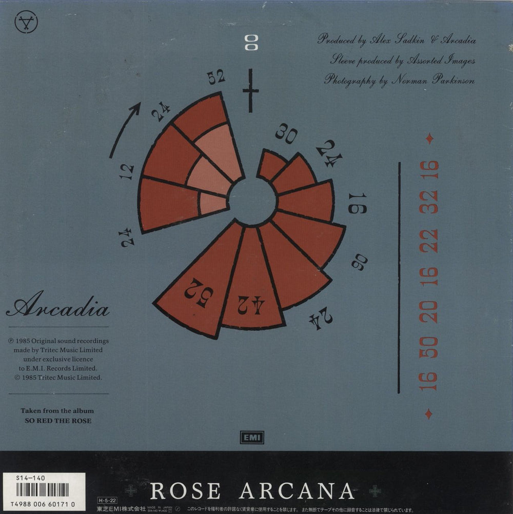 ARCADIA The Promise (1985 Japanese 3-track 12" vinyl single featuring Extended Remix and 7" Mix, plus Rose Arcana. Housed in a picture sleeve with Japanese text biography/lyric insert. The sleeve has an 'Arcadia' sticker on the front [attached by a previous owner] and shows some light storage wear, whilst the vinyl appears near as new S14-140)
