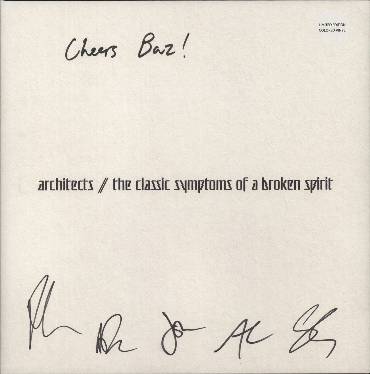 ARCHITECTS The Classic Symptoms Of A Broken Spirit (2022 Dutch 11-track LP, pressed on Clear & Sea Blue Galaxy Vinyl. Limited to 1000 copies, exclusively available at Amazon.co.uk. Embossed gatefold picture sleeve, with lyrics printed on the interior. The sleeve retains the hype-sticker and has been personalised and fully Autographed on the front. Both sleeve and vinyl are Near Mint 7932-1)