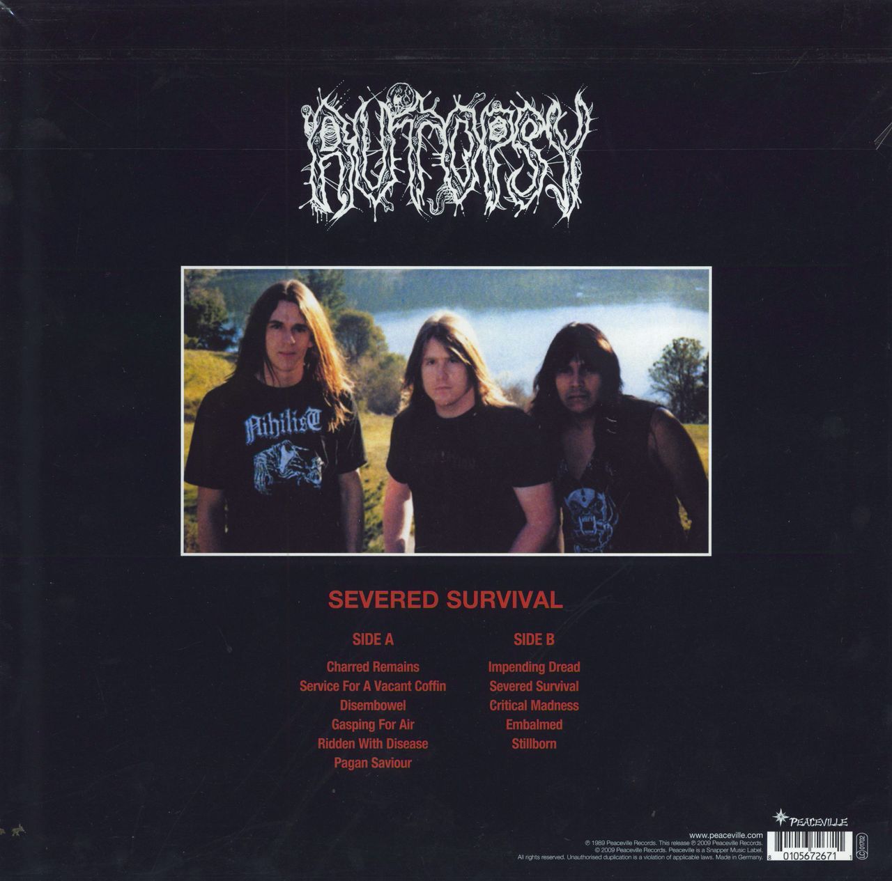 AUTOPSY Severed Survival (2017 UK/EU limited edition 11-track vinyl LP reissue of their 1989 debut album which was very influential for future death metal acts such as Cannibal Corpse, Entombed and Dismember as well as featuring Steve DiGiorgio [Death] on bass. Complete with a double-sided Peaceville insert, the picture inner has a seam split to one edge but the picture sleeve retains its original resealable outer bag and the vinyl looks barely played)