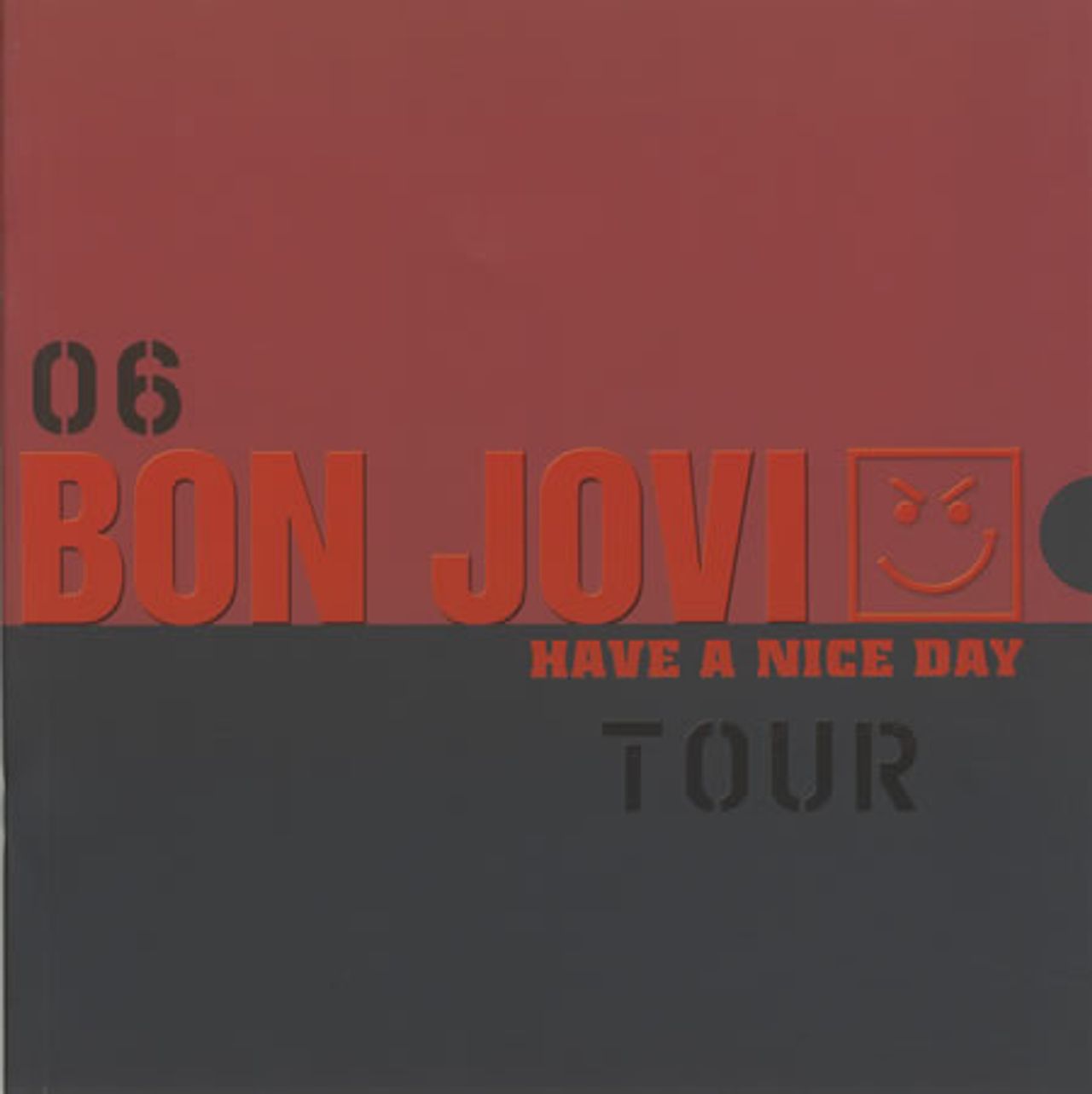 BON JOVI Have A Nice Day Tour 06 (2006 UK 32-page 11½" x 11½" full colour programme for the Have A Nice Day World Tour, which features many photos of the band live on stage and relaxing off stage, a printed rice-paper insert with the Smiling Face image from the album & snippets of lyrics dotted about the programme, spot varnished cover. The back cover has a little creasing, otherwise the inner pages are near as new)