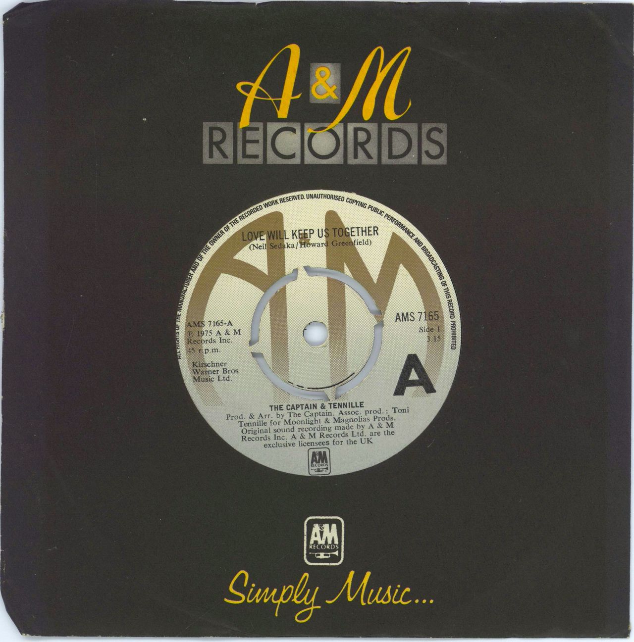 CAPTAIN & TENNILLE Love Will Keep Us Together (1975 UK 7" vinyl single with four-prong centre, also including Gentle Stranger, A&M comapny die cut paper sleeve AMS7165)