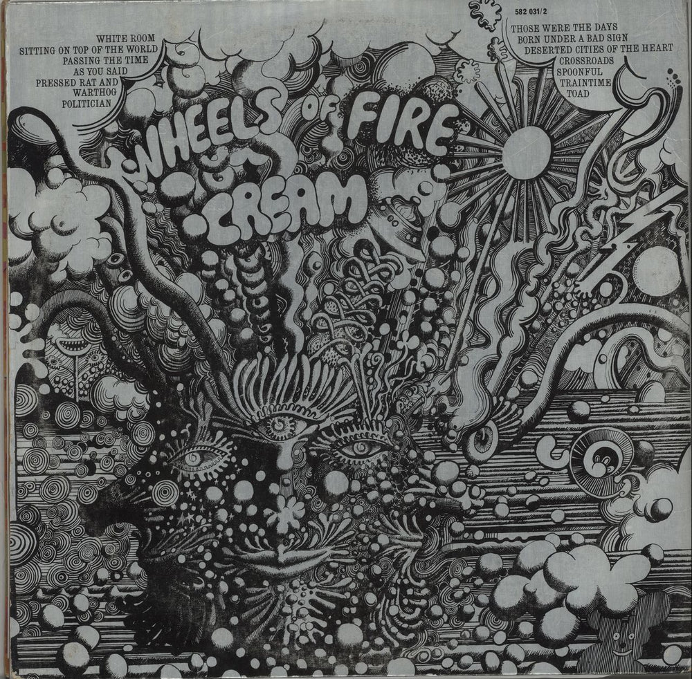 CREAM Wheels Of Fire (1968 UK 13-track MONO double vinyl LP, featuring recordings made In The Studio & Live At The Fillmore, gatefold picture sleeve. The sleeve remains VG with a few creases and a little scuffing to the foil finish, as all copies appear to have half a century on, with all text legible including along the spine & no writing. The vinyl carries a few light cosmetic marks/hairlines, not interfering with play - A great play copy of this 60's classic)