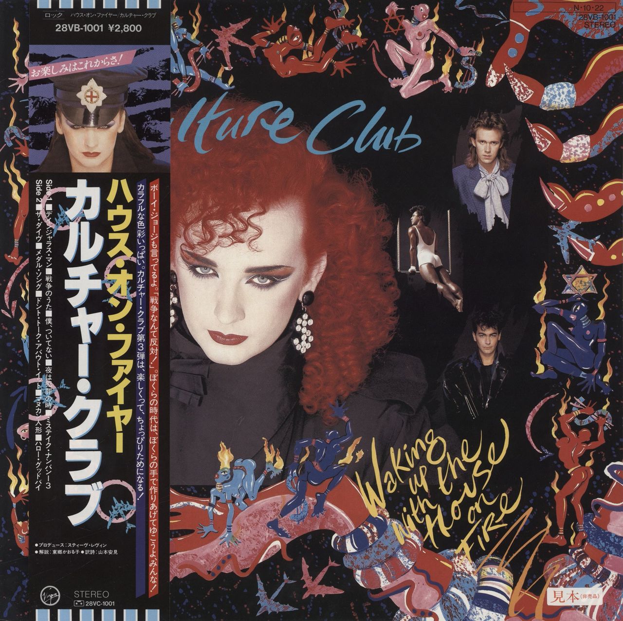CULTURE CLUB Waking Up With The House On Fire (1984 Japanese 10-track promo sample vinyl LP, their third album including the singles The War Song and The Medal Song. Housed in a glossy picture sleeve with a promo sticker on the front, completewith the fold-out Japanese & English lyric insert, and the original obi-strip. The packaging displays minimal wear and the vinyl looks barely played 28VB-1001)