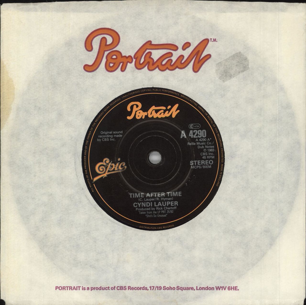 CYNDI LAUPER Time After Time (1984 UK solid centre 7" vinyl single with paper Portrait labels, also including I'll Kiss You, die-cut company sleeve A4290)