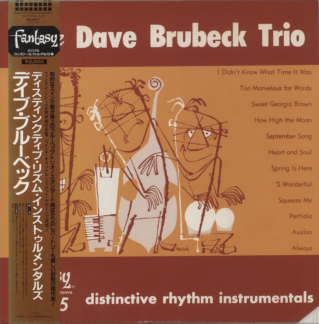 DAVE BRUBECK TRIO Distinctive Rhythm Instrumentals (1985 Japanese 12-track vinyl LP, compilation from Fantasy 3-2 and 3-4, with all songs originally recorded in 1950, featuring Ron Crotty and Cal Tjader. Housed in a pasted picture sleeve withJapanese insert and obi-strip. The sleeve has a small deletion clipped corner with some light general wear, and the vinyl has minimal signs of play)