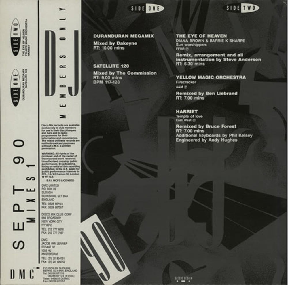 DMC September 90 Mixes 1 (1990 UK 5-track DJ only promotional vinyl 12" featuring exclusive mixes of tracks by Duran Duran, Satellite 120, The Eye Of Heaven, Yellow Magic Orchestra & Harriet, custom picture sleeve DMC92/1)
