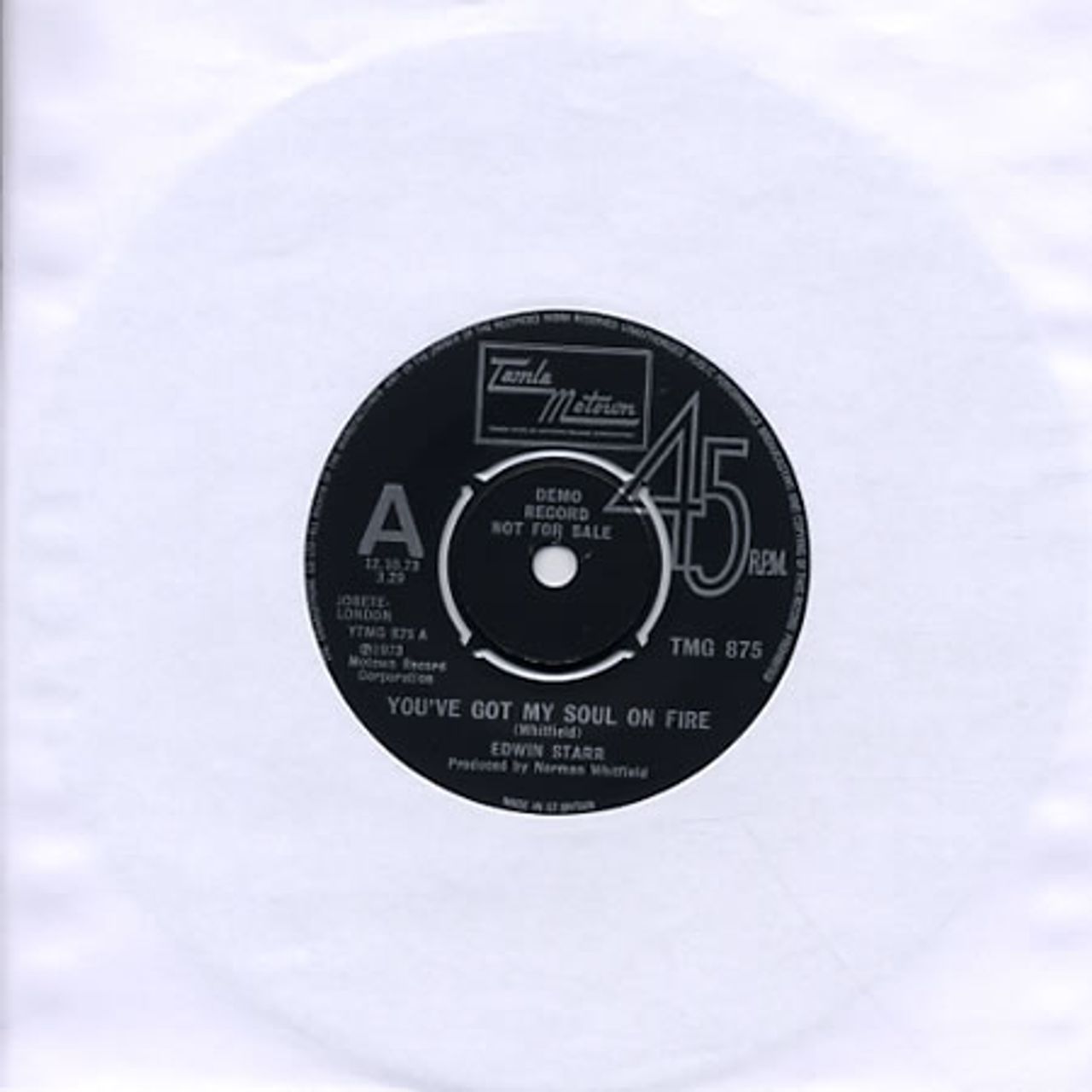 EDWIN STARR You've Got My Soul On Fire (Scarce original 1973 UK black Tamla Motown demo label 2-track 7" vinyl single, written and produced by Norman Whitfield, also featuring Love [The Lonely People's Prayer], arranged by H.B. Barnum. The release date of 12.10.73 is printed on the label and the original 4-prong centre is intact. Vinyl is in near MINT condition! TMG875)