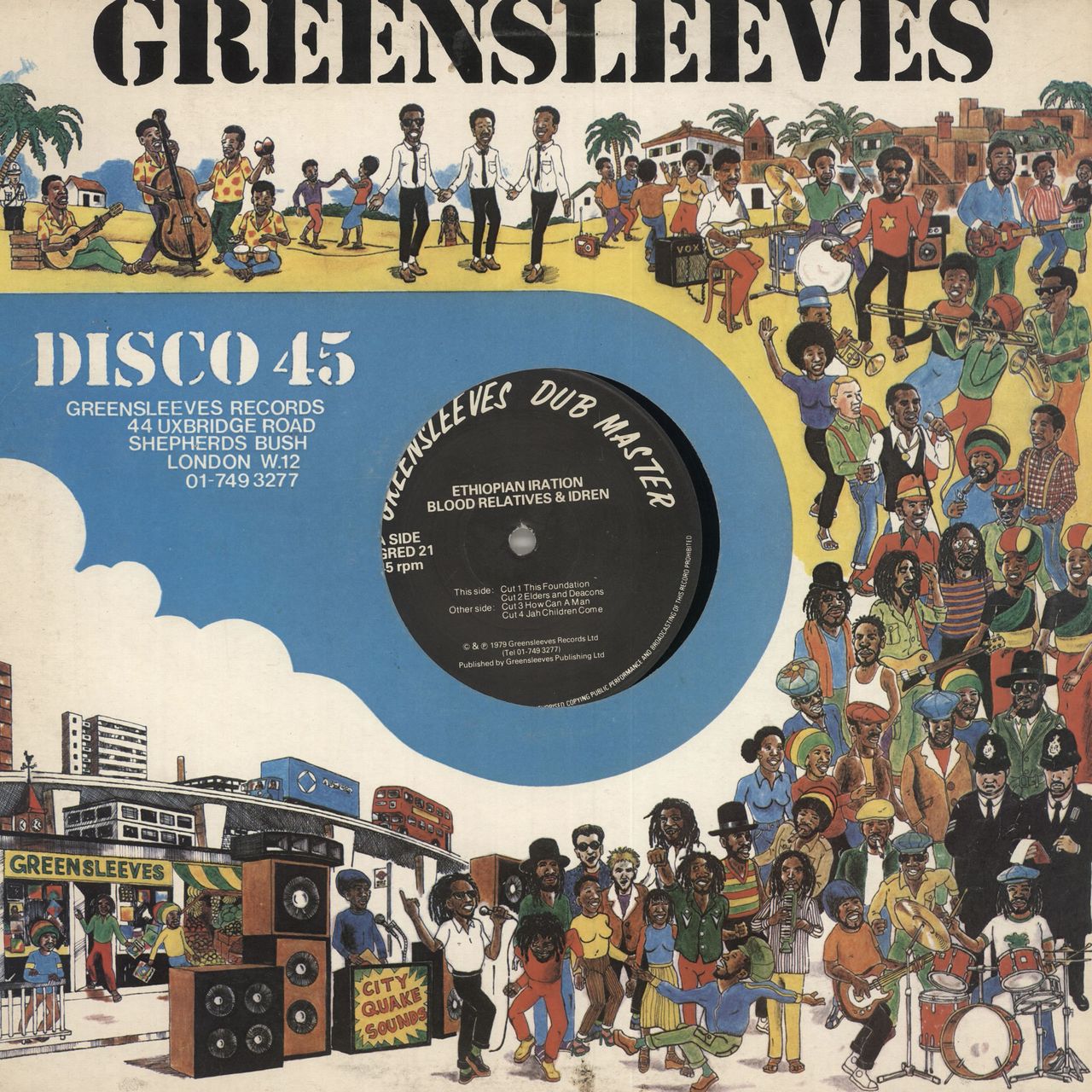 ETHIOPIAN IRATION Blood Relatives & Idren (1979 UK 4-track 12" vinyl EP, from the musical collective of Augustus Pablo, Bobby Ellis, Earl 'Chinna' Smith, Robbie Shakespeare and many more, comes this heavyweight offering. Includes This Foundation, Elders And Deacons, How Can A Man and Jah Children Come, diecut Greensleeves company sleeve. The vinyl has a few minor surface scuffs and is otherwise Excellent, ripe and ready to play loud - This will not disappoint GRED21