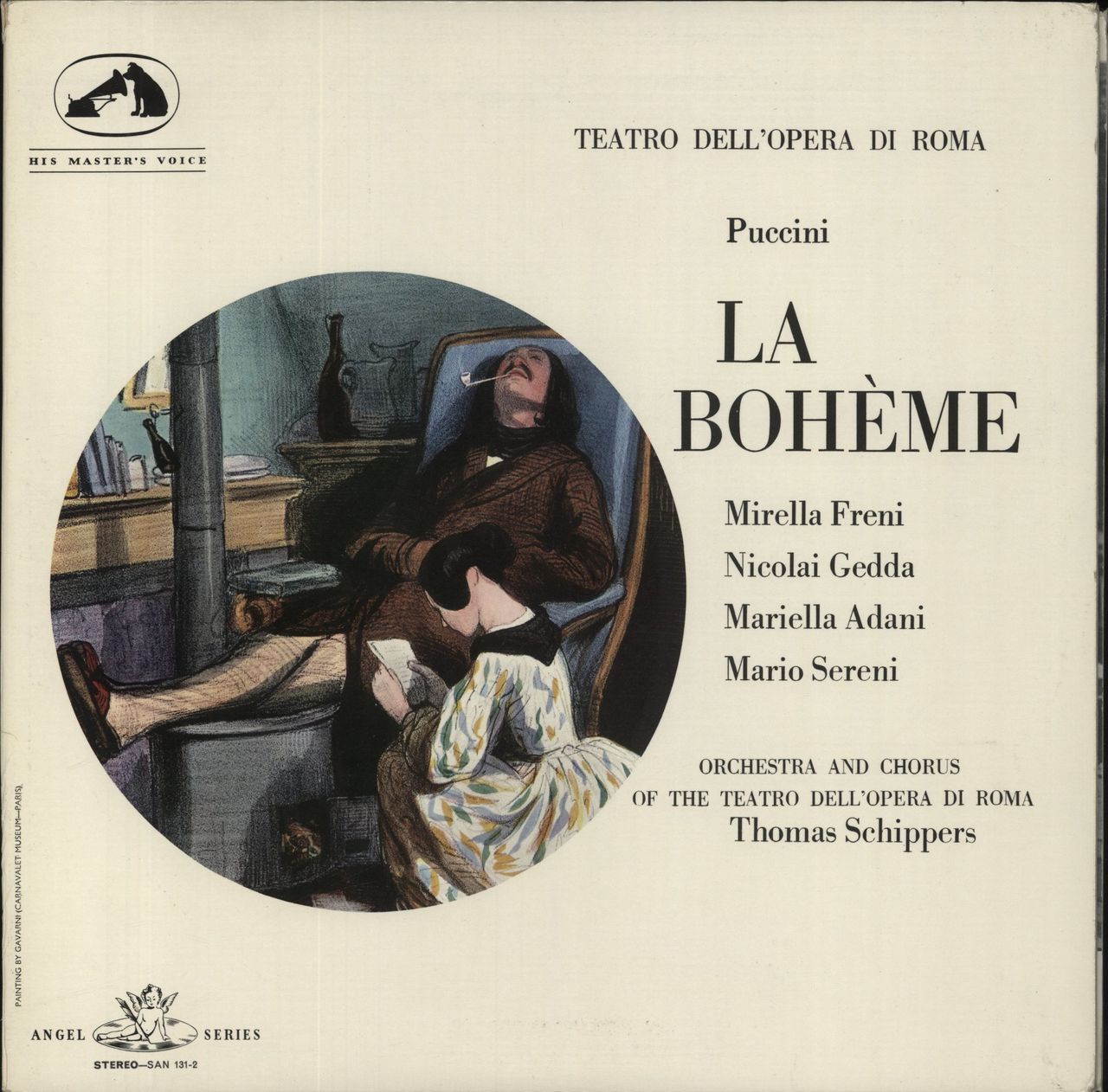THOMAS SCHIPPERS conducts THE CHORUS & ORCHESTRA OF THE TEATRO DELL'OPERA DI ROMA La bohème (1964 UK first issue stereo double STEREO vinyl LP on the gold white Nipper stamp Angel series label, housed in a front laminated gatefold picture sleeve with 32-page libretto booklet. The sleeve shows minimal wear and the vinyl is Near Mint - a stunning copy! SAN131-2)