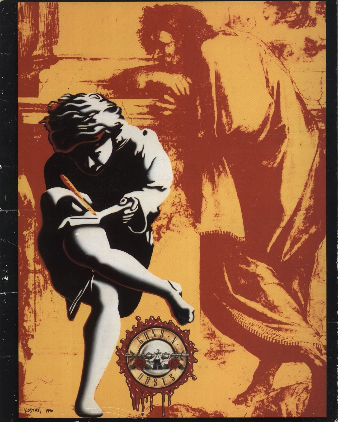 GUNS N ROSES Use Your Illusion Tour 1991 (Official 1991 UK 18-page 11" x 13" tour programme, features lots of photographs of the band in action, with superb glossy fold-out front & back covers featuring the artwork for the Use Your Illusion I& II albums. The programme remains in Excellent condition with a few light paper marks or minor signs of handling in the past. A great addition to your GNR collection)