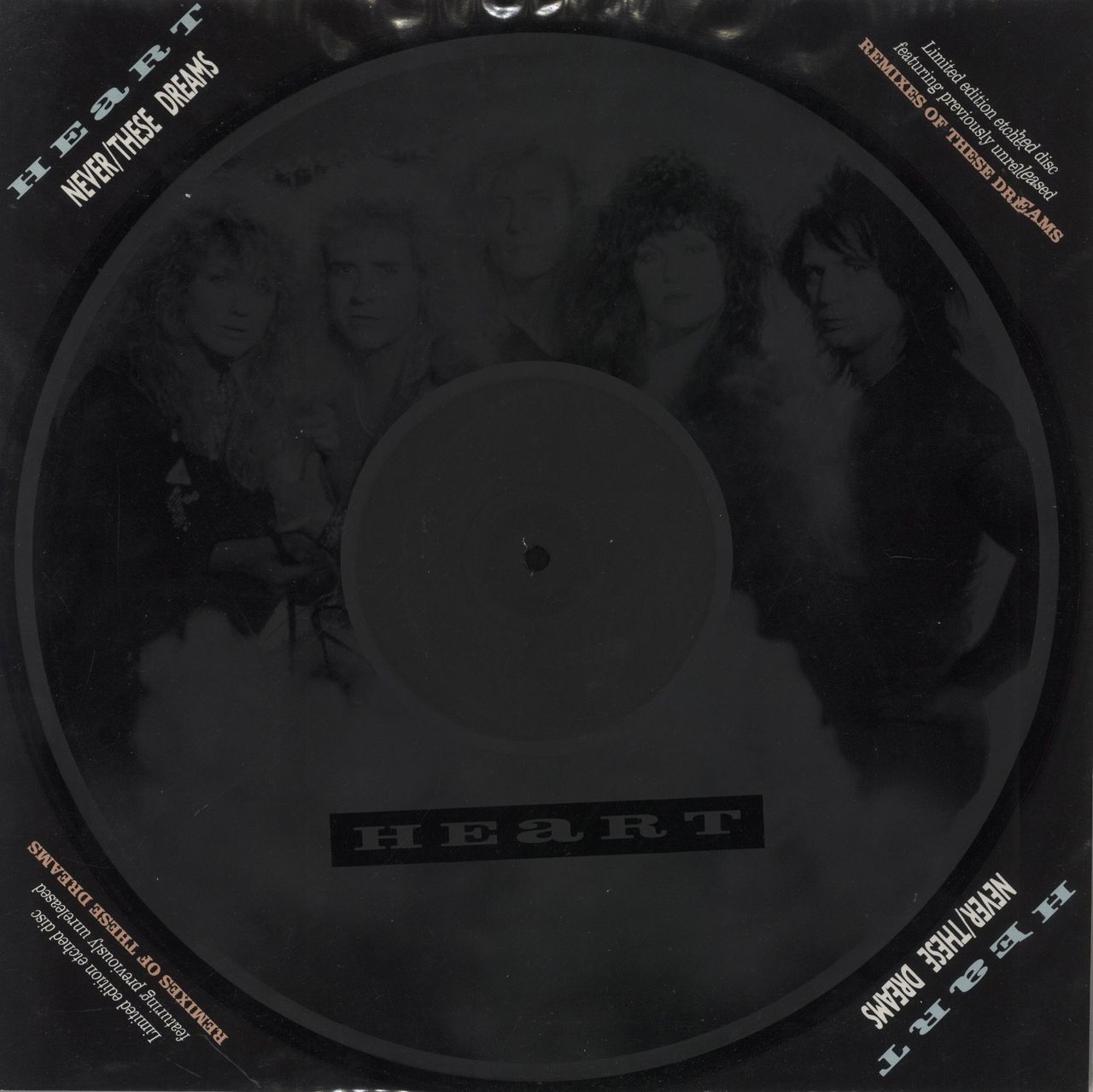HEART Never/These Dreams (1988 UK limited editon 4-track 12" single-sided ETCHED VINYL single featuring the Remix, Extended Remix and Instrumental Remix plus Never. The b-side has an etched image of the group, housed in a clear PVC sleeve withbacking insert 12CLE482)