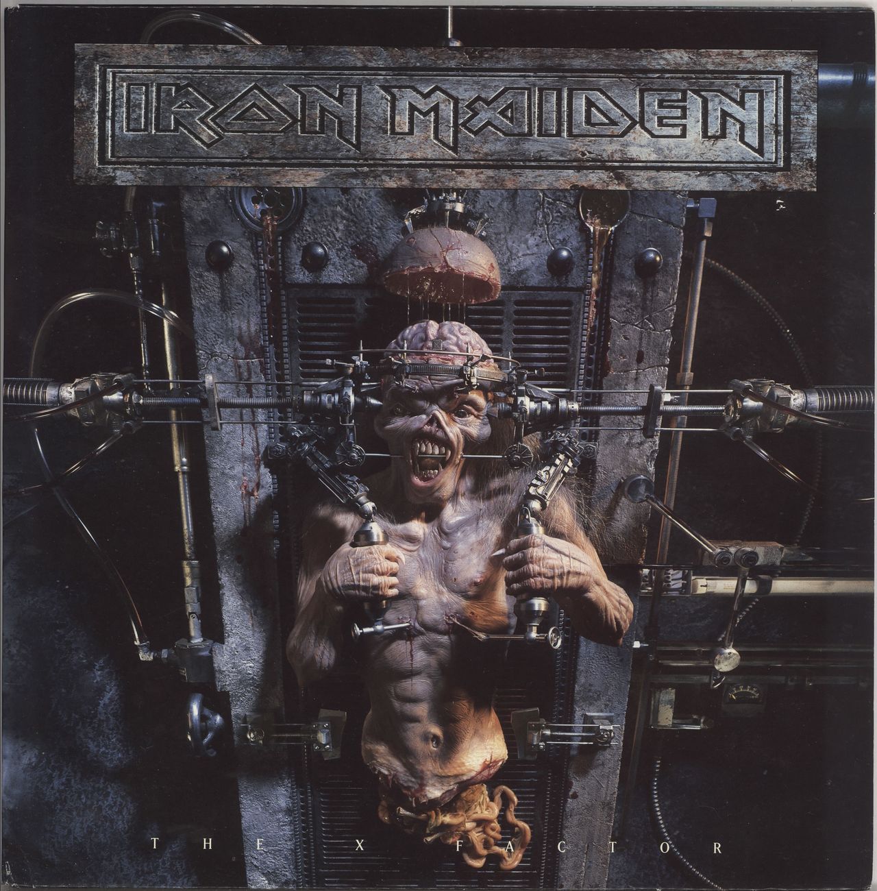 IRON MAIDEN The X Factor (Super rare 1995 UK 11-track Double LP pressed on Clear Vinyl with picture labels, the tenth studio album by the English heavy metal band and their first to feature Blaze Bayley on vocals, glossy gatefold picture sleeve complete with the huge fold-out picture/lyric poster insert. The sleeve has the start of a small split at the top of the sleeve & some light edge scuffing, otherwise displays just light age wear, whilst the vinyl appears barely played. A really niceexample EMD1087)