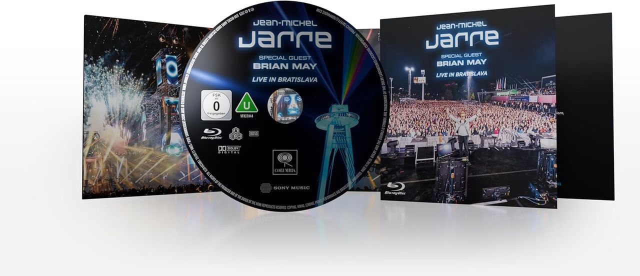 JEAN-MICHEL JARRE feat. BRIAN MAY Live In Bratislava (2025 UK/EU limited edition 4K | Dolby True HD 5.1 Blu-Ray Disc featuring the Full Bratislava Concert Movie filmed live on 12 May 2024 at the SNP Bridge in Bratislava. Live In Bratislava captures Jean-Michel Jarre's spectacular open-air performance with Sir Brian May as guest collaborator. Combining light, laser, drone and fireworks in one of his most ambitious productions to date, Jarre redefined theboundaries of live spectacle for a global audience. The Blu-ray features the full concert in high definition, including Jarre and Brian May's unique reimagining of Dvorák's New World Symphony, alongside Bratislava Time and Rendez-vous Bratislava. Presented with immersive audio mixes, the film highlights Jarre's ongoing commitment to innovation in sound and vision. Fold-out digi-style picture sleeve with hype sticker, factory sealed. Recommended)