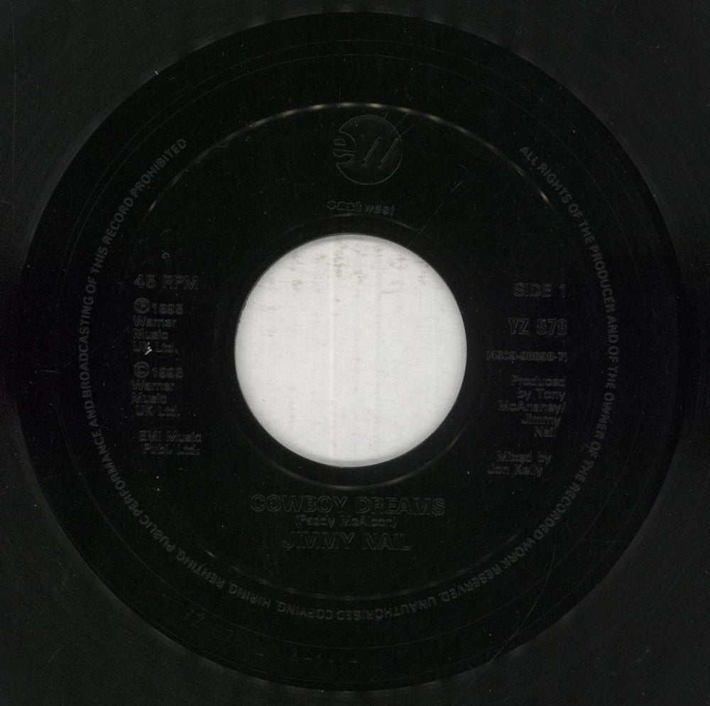 JIMMY NAIL Cowboy Dreams (1995 UK UK wide centre vinyl 7" for the single release, pressed exclusively for jukebox use with black injection labels, also including Bitter And Twisted [Jed's Demo], plain card sleeve with the original jukebox selection card tab attached to the front. The vinyl remains in Excellent condition with only a few light signs of play on both sides)