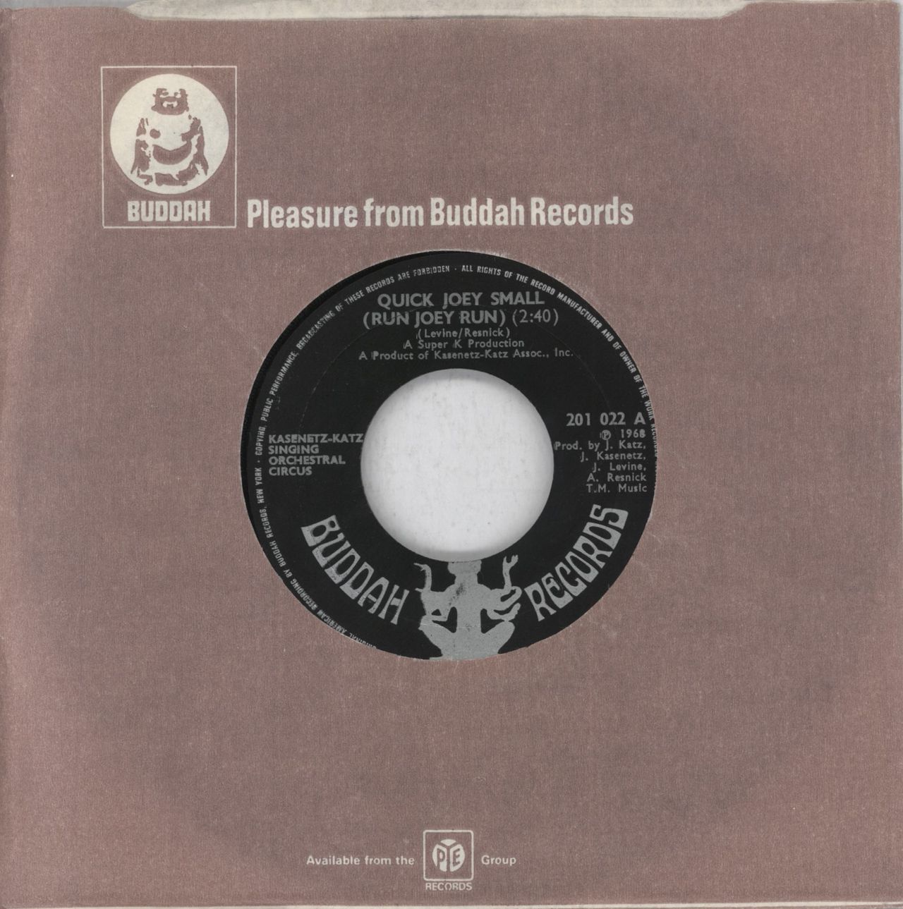 KASENETZ-KATZ SINGING ORCHESTRAL CIRCUS Quick Joey Small (Run Joey Run) (1968 UK wide centred 7" vinyl single, also including Rumble '69, Buddah die-cut company sleeve)