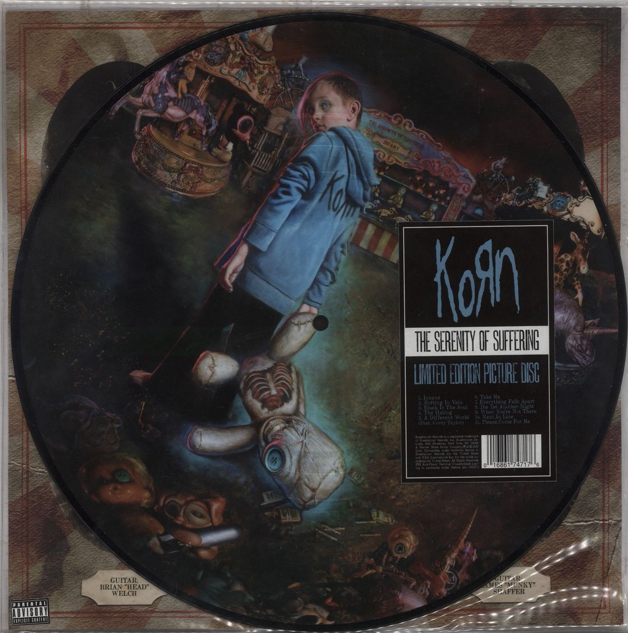 KORN The Serenity of Suffering (2016 US Limited Edition 11-track Picture Disc LP, featuring artwork exclusive to this format and issued to coincide with the release of their twelfth studio album. Produced by Nick Raskulinecz, this record marked a return to the band’s heavier roots, including the singles Rotting In Vain, Take Me and A Different World featuring Slipknot’s Corey Taylor. Housed in a clear PVC sleeve with printed backing insert and the original hype-sticker affixed to the front. The sleeve shows a couple of light splits to the left and right edges, otherwise remains fully intact, while the disc does show a hairline scratch on Side B; it has been play tested and there is no issue with playback — overall Very Good example of this striking picture disc edition)