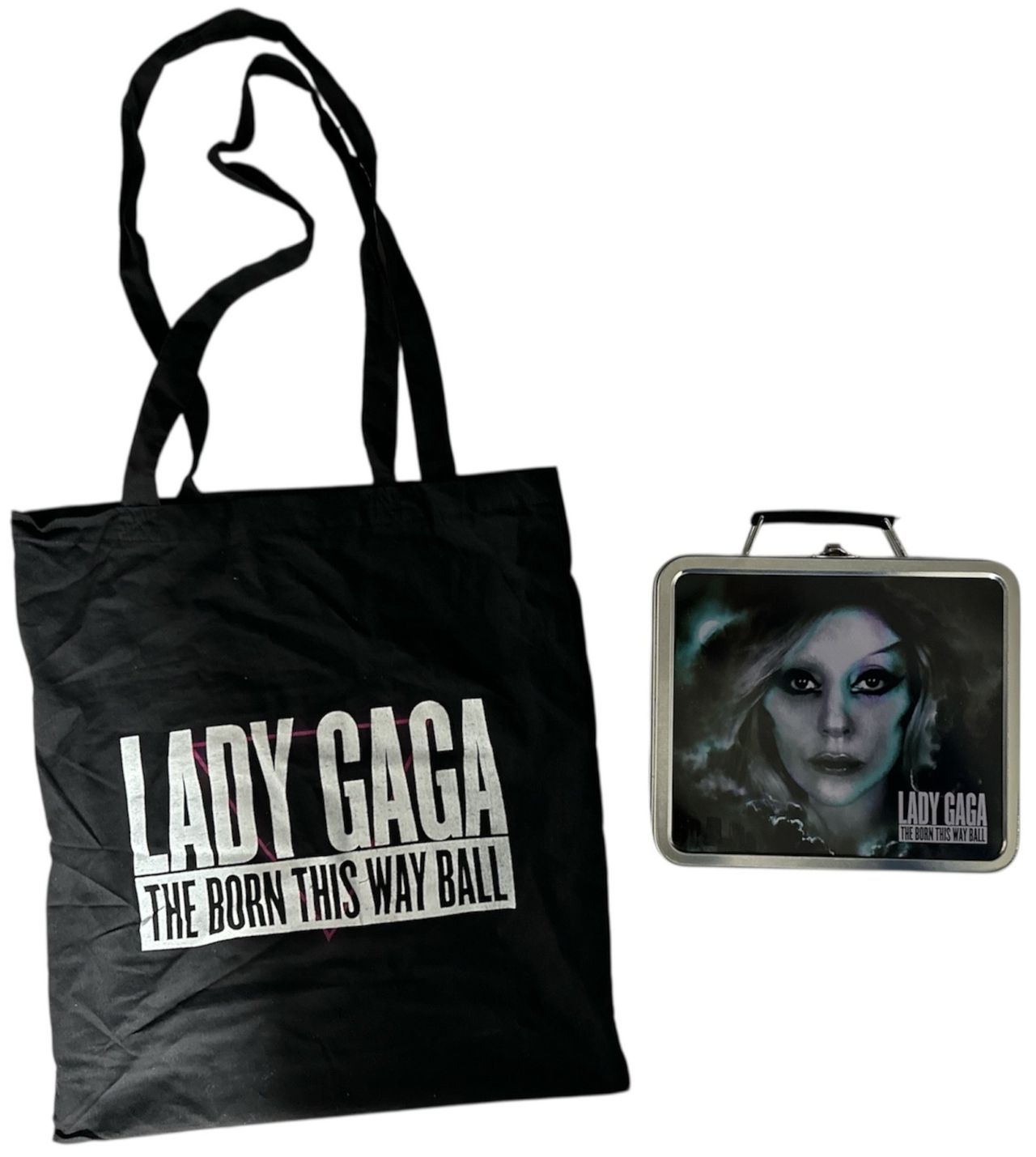 LADY GAGA Born This Way Ball Tour Bundle (This bundle gathers original VIP memorabilia from Lady Gaga's Born This Way Ball at Twickenham Stadium on 8th September 2012 - a night defined by towering spectacle, a full castle set and the bold, provocative theatricality that made the tour one of Gaga's most visually ambitious productions. Included are the original ticket stub, the Premium Heavy Metal Lover VIP itinerary, matching VIP menu card and the official laminate with branded lanyard. Also inside the bundle are Born This Way socks [sealed and unused], a Born This Way thermal travel mug [unused] and a metal clip-top lunchbox emblazoned with Queen Gaga herself - all housed in a Born This Way tote bag. Every piece captures the era's fierce aesthetic and maximalist energy. A vivid time capsule from the tour where Gaga turned a stadium into a cathedral of pop freedom!)