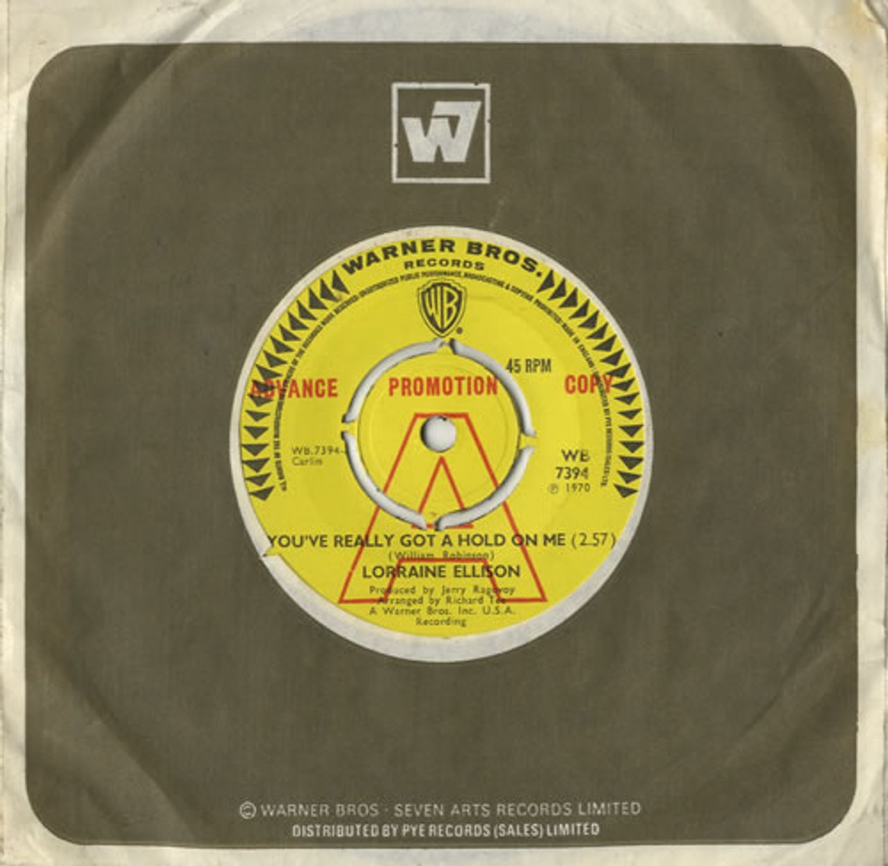 LORRAINE ELLISON You've Really Got A Hold On Me (1970 UK 'A' label advance promotional vinyl 7" for the single release, with intact original four prong centre, also featuring You Don't Know Nothing About Love, Warner Brothers company die cut paper sleeve WB7394)