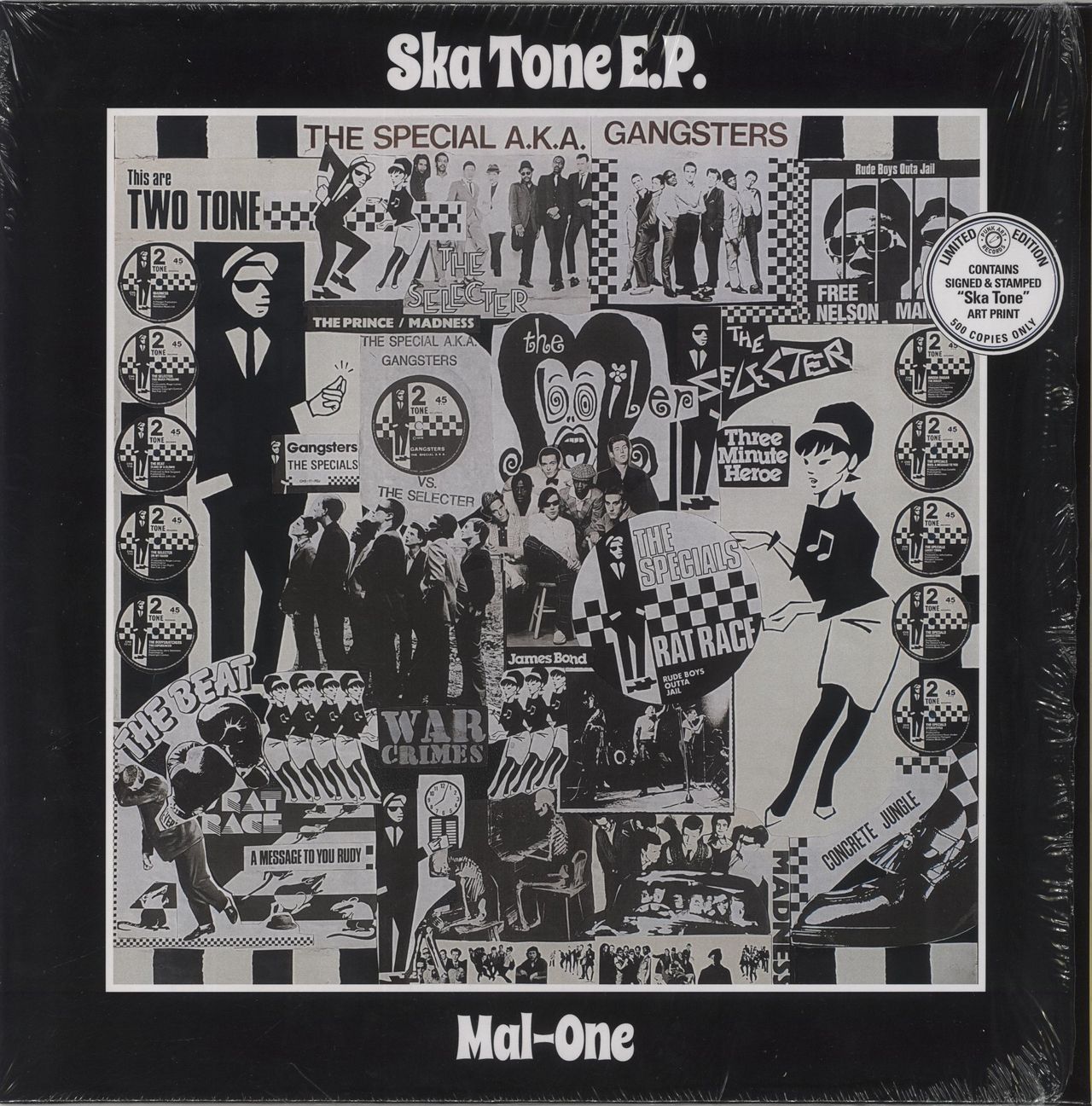 MAL-ONE Ska Tone EP (2025 UK limited edition 6-track vinyl 12" featuring tracks from the London artist & musician MAL-ONE. Linked to his Jamaican Ska project, this features self composed tracks all in a decollage picture sleeve featuring the classic black & white imagery of the 2-Tone era. Limited edition of 500 copies only, each with a 'Ska Tone' art print which has been blind stamped and signed by the artist himself and shrink sealed from new MAL-ONE12-003)