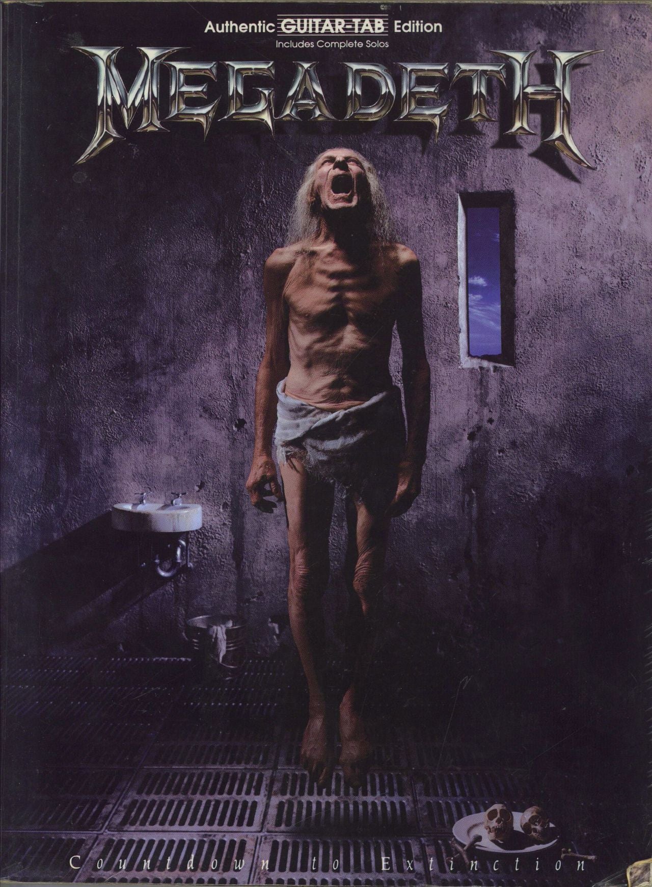 MEGADETH Countdown To Extinction (1992 US 124-page softback songbook featuring all eleven songs from the album, arranged for voice and guitar in standard notation and guitar tablature, including lyrics and chord symbols. Arranged by Hemme Luttjeboer, the book also includes black & white pictures of the band members, inside cover illustrations and great cover artwork. The cover shows some light storage wear and scuff marks, whilst the inner pages remain in excellent condition)