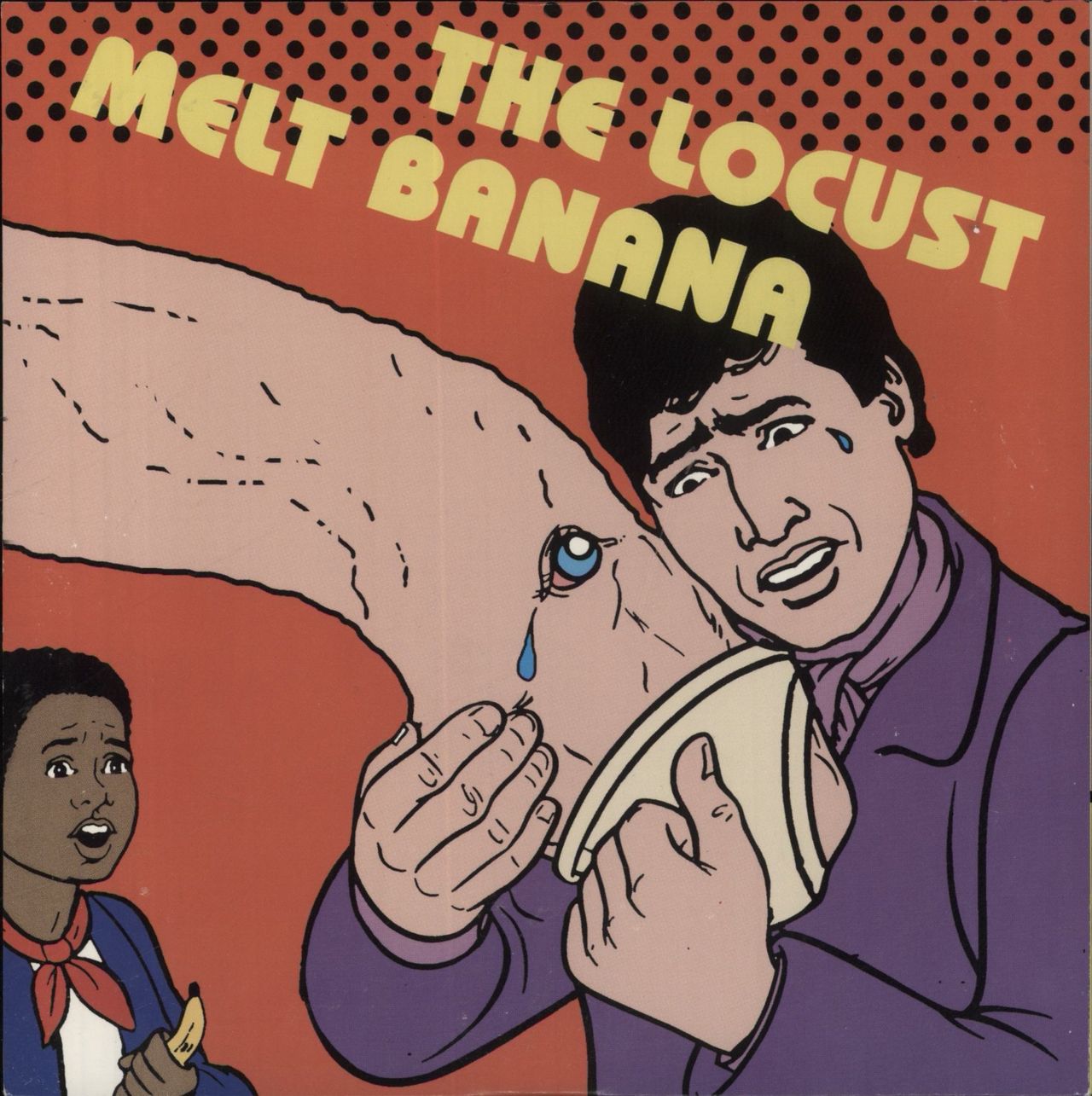 THE LOCUST / MELT BANANA The Locust / Melt Banana (2002 US 7-track 7" split EP, pressed on Yellow Vinyl. Combined efforts from San Diego's grindcore legends and the experimental noise rock stalwarts from Tokyo. Loopy and aggressive with short but not-so-sweet tracks such as 'The Half-Eaten Sausage Would Like To See You In His Office' and 'Creeps In A White Cake'. Pop artwork style picture sleeve with lyric insert. The sleeve shows only light general shelfwear and the vinyl is Near Mint GSL48)