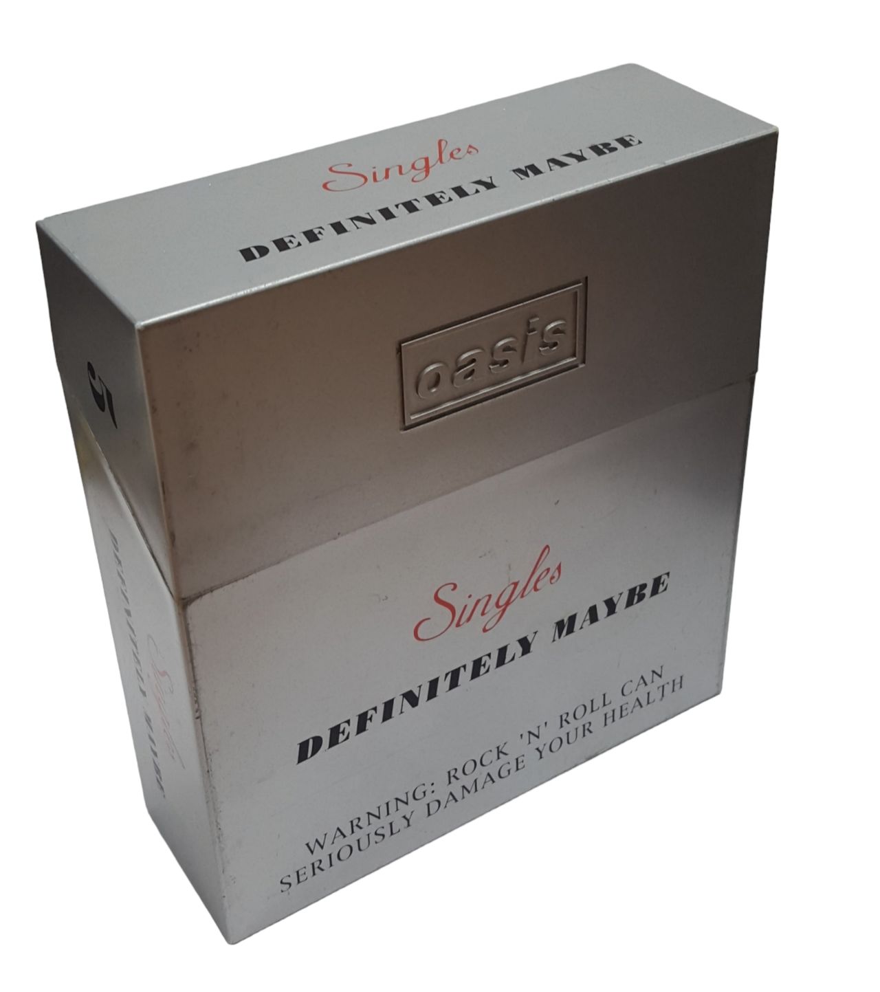OASIS Singles - Definitely Maybe (1996 UK-only FIVE CD single box set, a total of eighteen songs, including Supersonic, Shakermaker, Live Forever & Cigarettes & Alcohol, with an exclusive interview CD & 12-page glossy collectors booklet, all housed in a silvery grey flip-top box styled like the B&H cigarette box. The box shows little of its age with light wear only. The contents show only very minor evidence of handling CREDM002)