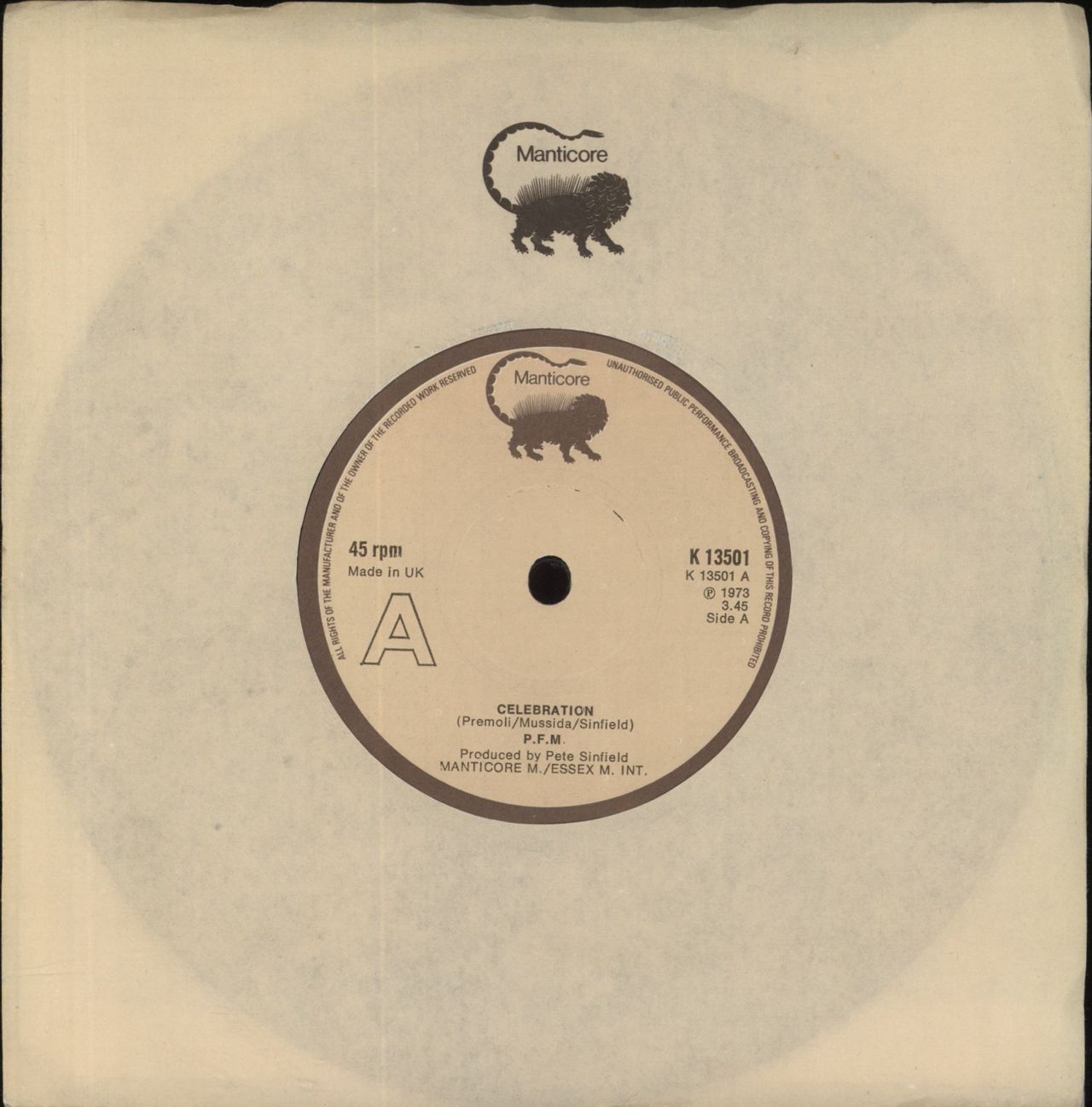 P.F.M. Celebration (1973 UK 7" vinyl single with solid centre label, also includes 'Old Rain', Manticore die-cut company sleeve K13501)
