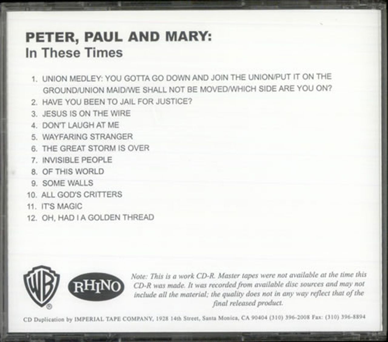 PETER PAUL & MARY In These Times (Official 2004 US Rhino 12-track advance promotional CD-R acetate of the album, custom printed disc + title/tracklisting back insert)