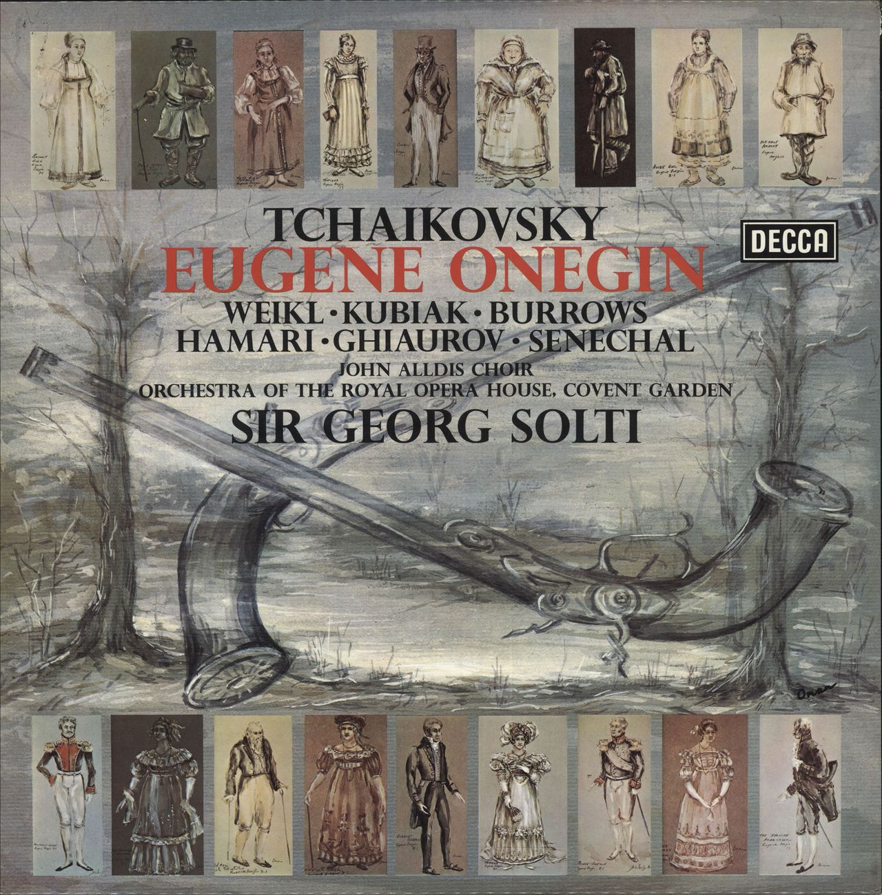 SIR GEORG SOLTI conducts the ORCHESTRA OF THE ROAYL OPERA HOUSE, COVENT GARDEN Tchaikovsky: Eugene Onegin (1975 UK 10-track triple vinyl LP set, with performances by Bernard Wikl, Teresa Kubiak, Julia Hamari and others, presented in a picturebox with 40-page libretto/sleevenotes booklet. The box shows just a little wear and the vinyl appears barely played SET596/8)