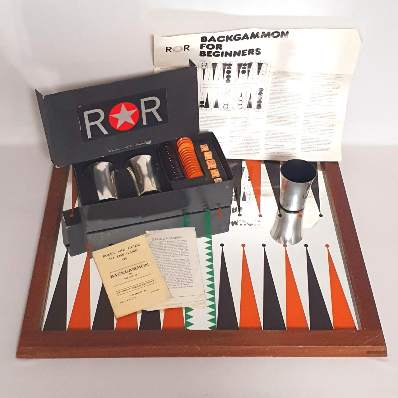Also in the box is a booklet of backgammon rules & a large fold out R-O-R headed 'Backgammon For Beginners' sheet.