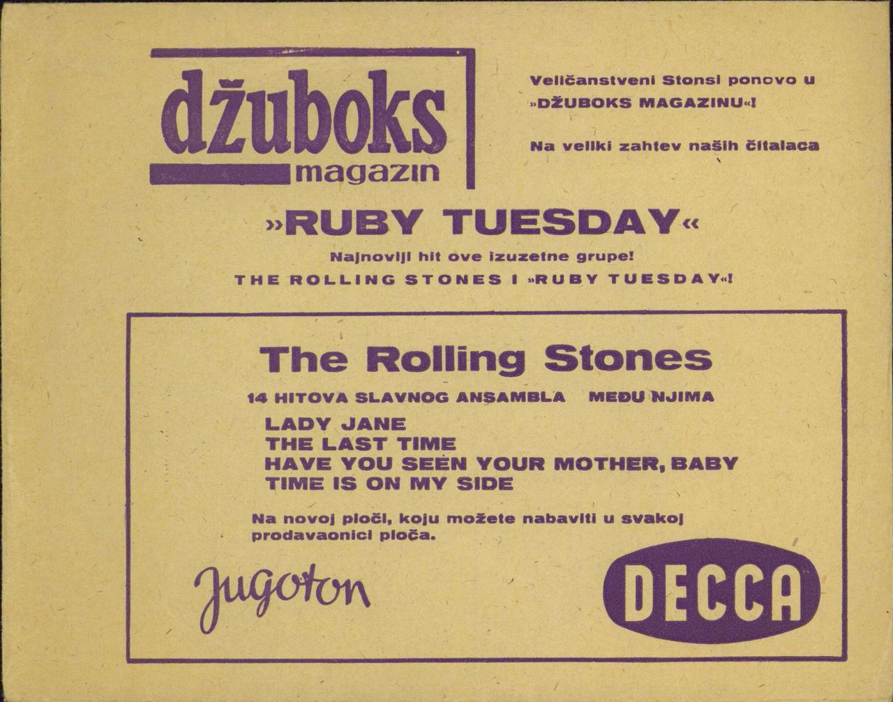 ROLLING STONES Pokladni Utorak (Rare 1967 Yugoslavian one sided 6" flexi disc for Ruby Tuesday, available only with Džuboks Magazine, housed in the original brown paper envelope printed in purple. The black disc printed with white text, remainsExcellent with minimal signs of play, and the envelope sleeve shows little wear or signes of age. A fantastic example and the first we have ever seen)