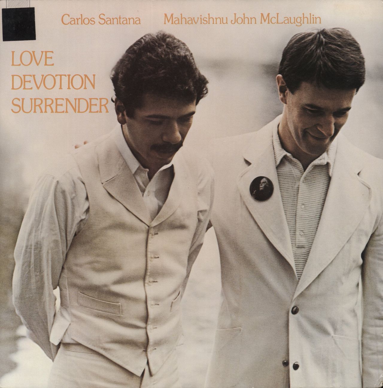 CARLOS SANTANA & JOHN McLAUGHLIN Love Devotion Surrender (1973 US export 5-track LP from the two legendary guitarists with the backing of their respective bands, Santana & The Mahavishnu Orchestra. The gatefold picture sleeve & the labels haveall references to Columbia blanked out with black tape for sales abroad. The sleeve is Excellent with a minor corner bump & the vinyl appears barely played C32034)