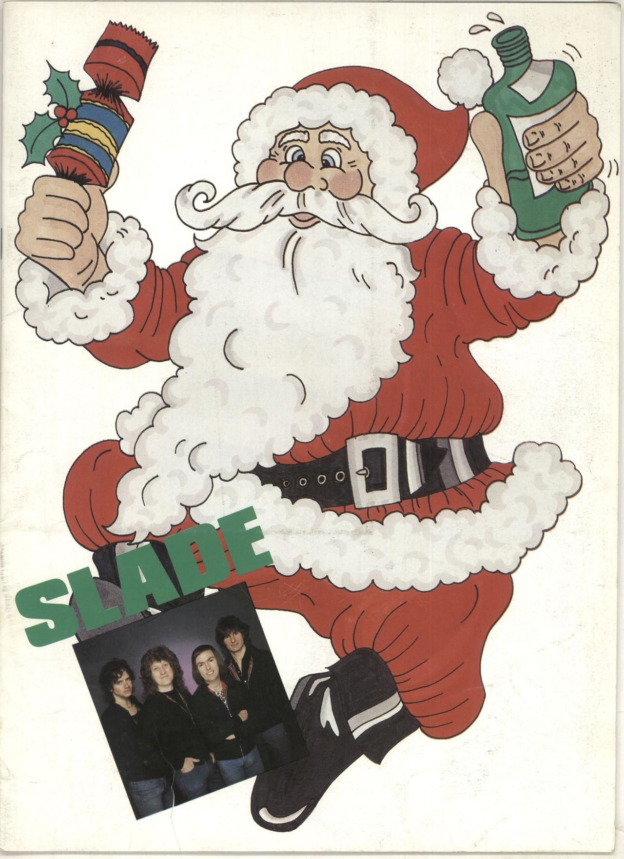 SLADE 1982 Tour (Rare original 1982 UK 16-page 13" x 9½" festive tour programme for their UK Christmas tour featuring tour personnel, lyrics to the classic Merry Xmas Everybody and great photographs/cartoons, with Santa picture cover. The cover displays some light wear or signs of age but is otherwise in a really nice condition)