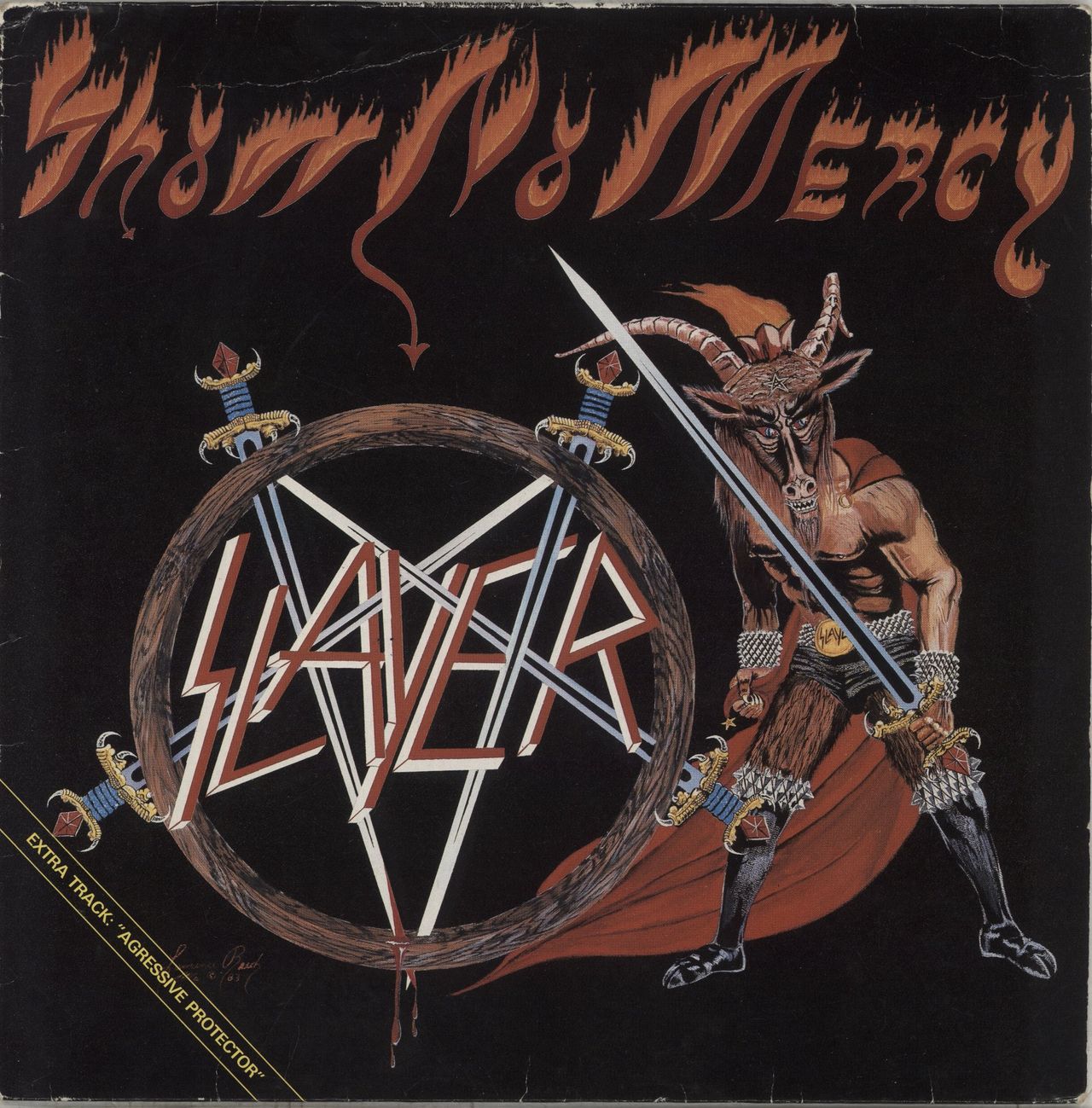 SLAYER Show No Mercy (1984 Dutch 11-track vinyl LP, the debut album from American thrash pioneers, including the bonus track Agressive Protector, only listed on the sleeve as a song flash on the front cover, complete with illustrated lyric inner. The sleeve shows some notable edgewear and creasing, the inner shows a small seam split on the bottom, whilst the vinyl is in Very Good condition with some hairlines visible but not affecting playback. RR9868)