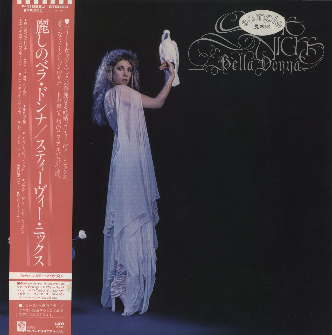 STEVIE NICKS Bella Donna (1981 Japanese 10-track promo sample vinyl LP with rainbow WEA label, the debut solo release from Fleetwood Mac's leading lady, including the classic hit Edge of Seventeen and her duet with Tom Petty: Stop Draggin My Heart Around, issued in the sample-stickered matt picture sleeve complete with Japanese text & lyric inserts plus the pink & white discography obi-strip. The sleeve shows minimal wear and the vinyl is Near Mint P-11055J)