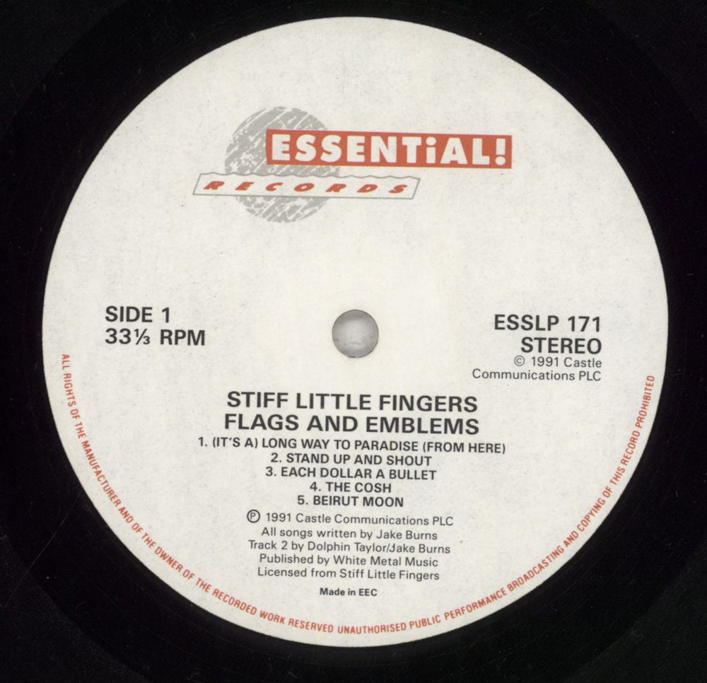 STIFF LITTLE FINGERS Flags & Emblems (Scarce original 1991 UK 10-track vinyl LP - This was Jake Burns & co's first studio in almost ten years but was also the first to feature The Jam's Bruce Foxton with an additional guest appearance from Rory Gallagher, including the single Beirut Moon. The glossy picture sleeve has been signed by Dolphin Taylor, Bruce Foxton, Jake Burns and Henry Cluney. The sleeve just light shelfwear but comes with its fold-out lyric insert and the vinyl remains excellent. Punks Not Dead! ESSLP171)