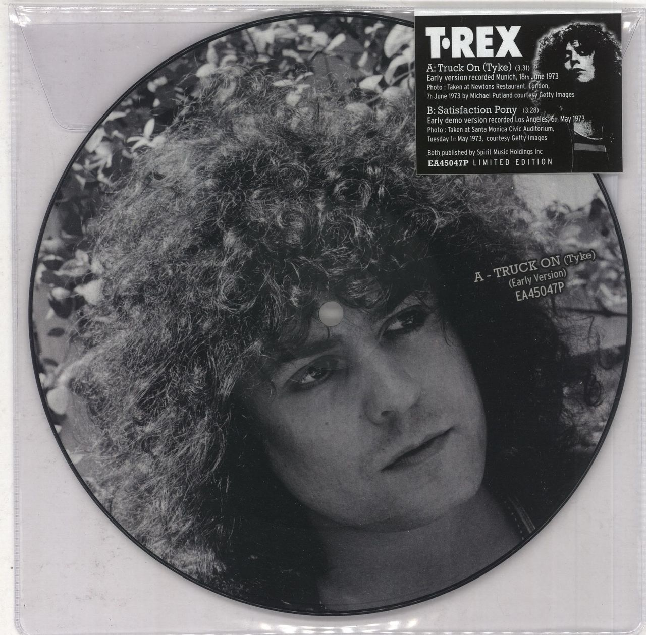 T-REX Truck On (Tyke) (2020 UK limited edition 7" Picture Disc b/w Satisfaction Pony - The last year of recordings of the classic line up with Tony Visconti producing. Recorded in the U.S & Germany less than a month apart. 'Truck On' having been demoed acoustically in Tony Visconti's flat with wife Mary ( Hopkins ) harmonising in October 1971 it took 20 months to actually record the song, which was then issued as a single within the next 5 months in November 1973 and was thefirst T.Rex single to not enter the top 10 stalling as it did at 13 . This version is less polished and much more appealing to fans than the released version it's been argued. Satisfaction Pony a re- recorded final version ended up on the B side of the Teenage Dream single in February 1974. Clear sleeve sealed with picture hype sticker)