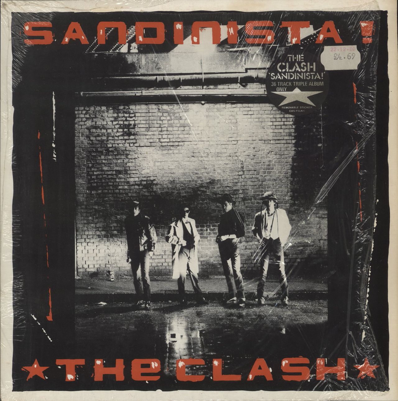 THE CLASH Sandinista! (Classic 1980 UK first press 36-track triple LP including The Magnificent Seven, Hitsville UK & The Call Up, housed in the wide fully spined single-pocket picture sleeve complete with the black & white hype sticker attached plus the 'Armagideon Times No. 3' fold-out lyric insert. This is a superb one previous owner example. The sleeve is still in the open shrinkwrap with the vintage price sticker attached dated '22.12.80' & all three vinyl discs still look barelyplayed FSLN1)