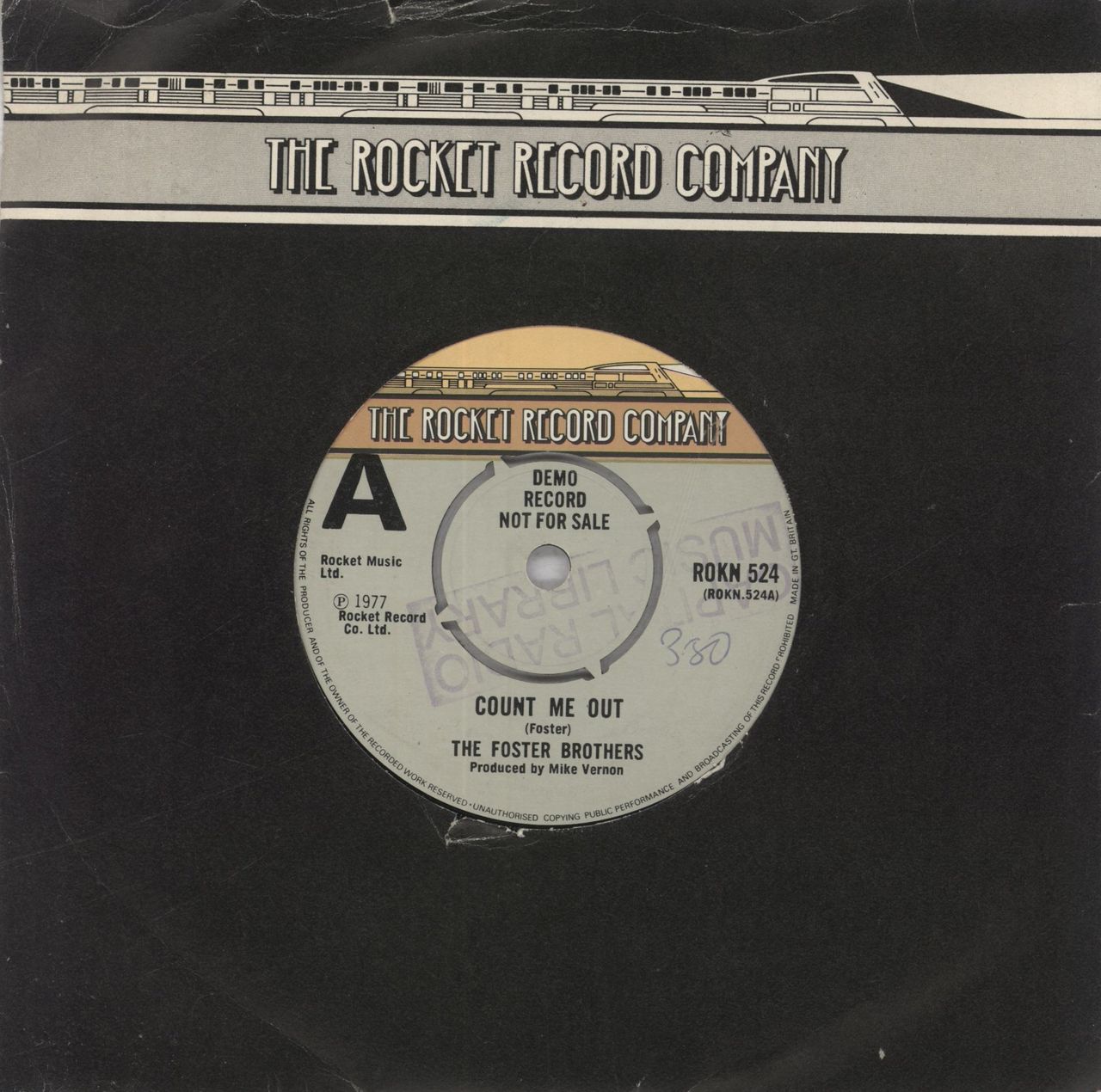 THE FOSTER BROTHERS Count Me Out (1977 UK 7" vinyl single with four-prong centre with'Demo Record-Not For Sale' stamp, includes Amazin, Rocket Record Company die-cut sleeve ROKN524)