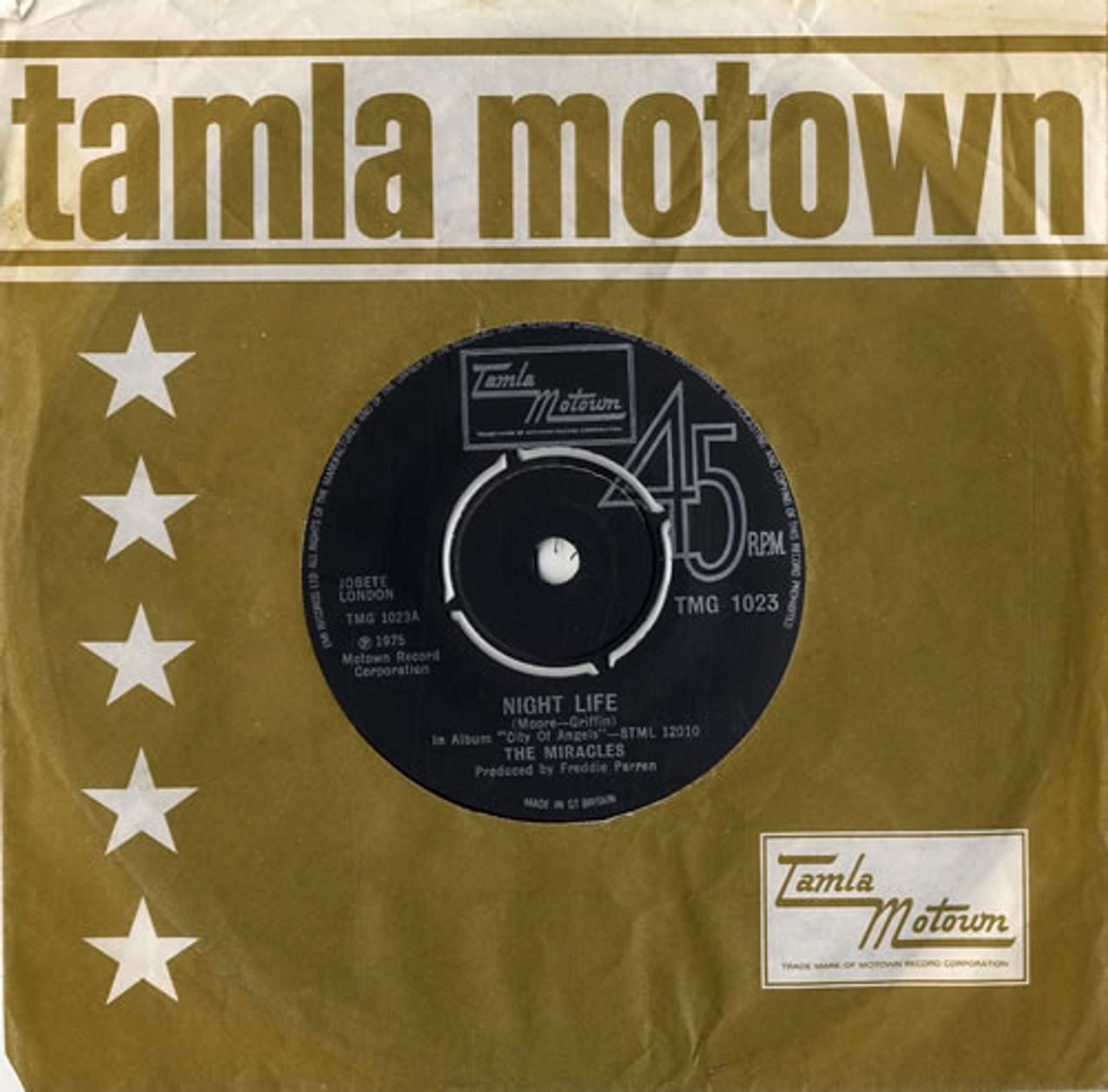 THE MIRACLES Night Life (1976 UK 7" vinyl single with intact four prong centre, also including Overture, Tamla Motown company die cut paper sleeve TMG1023)
