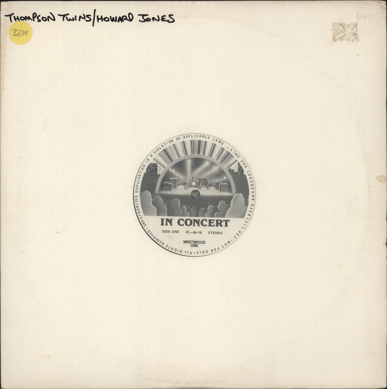 THOMPSON TWINS / HOWARD JONES In Concert (Rare original US vinyl 2-LP Westwood One radio show, first broadcast the weekend of 3rd–5th August 1984, both acts recorded at the Glasgow Apollo in Scotland on different nights. The program features complete live performances, divided into six segments with original commercials and announcer intros. The Thompson Twins set includes classics like Into The Gap, Doctor! Doctor!, You Take Me Up, and Hold Me Now, while Howard Jones delivers stunning live renditions of What Is Love?, Equality, and Dreams of a Better Place. These syndicated concerts were often recorded live or compiled from live performances, and distributed via vinyl to radio stations across the U.S. Shows like this allowed audiences nationwide to hear artists they might not see live and were an important medium for music discovery in the pre-digital era. Housed in a plain card sleeve with the original cue sheet, the vinyl has only a few light signs of play)