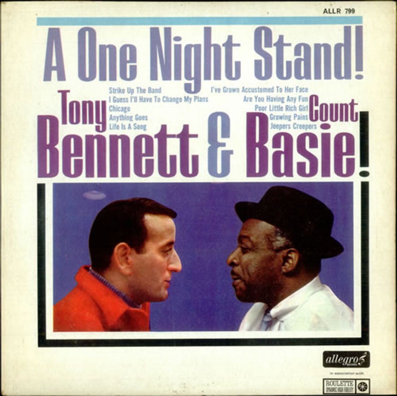 TONY BENNETT & COUNT BASIE A One Night Stand! (1966 UK first issue 10-track LP on the rough black Allegro label, front laminated picture sleeve with the tracklisting and sleevenote on the back. The sleeve shows just a little light wear with age yellowing at the edges ans a small mark to the unlaminated back, the vinyl is superb with just a couple of light surface scuffs to show for its forty years ALLR799)
