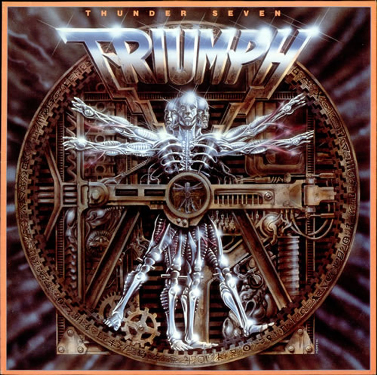 TRIUMPH Thunder Seven (1984 UK 10-track vinyl LP - the seventh studio release and concept album, including the single Follow Your Heart along with two instrumental recordings, produced by the band and Eddie Kramer. Housed in a glossy picture sleeve with artwork based on Vitruvian Man by Leonardo da Vinci and designed by Dean Motter. The sleeve has a little corner scuffing and edgewear, whilst the vinyl appears barely played MCF3246)