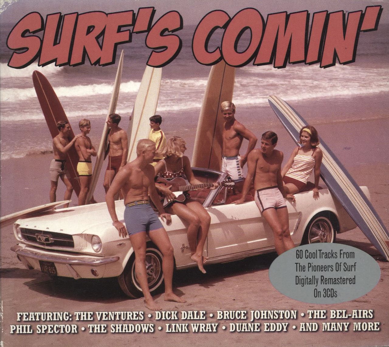 VARIOUS Surf's Comin' (2011 UK 60-track digitally remastered 3-CD album compilation of cool tracks from the pioneers of surf, including The Ventures, Link Wray, Duane Eddy & The Rebels, Dick Dale, Johnny & The Hurricanes, The Shadows, The Vampires and many more. Housed in a fold-out digipak picture sleeve NOT3CD065)