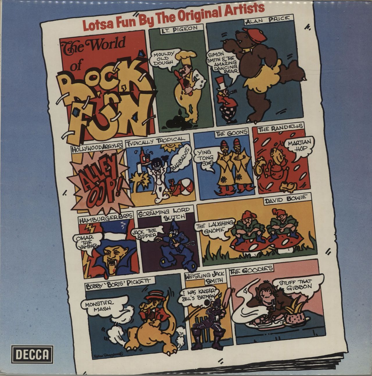 VARIOUS The World Of Rock 'n' Fun (1975 UK 12-track LP featuring a gaggle of vintage wacky tunes including Stuff That Gibbon, Ying Tong Song, Jack The Ripper, Monster Mash & more, a disc of fun packed frivolity, front laminated picture sleeve. The sleeve & vinyl are Excellent with minor signs of wear & play SPA-R483)