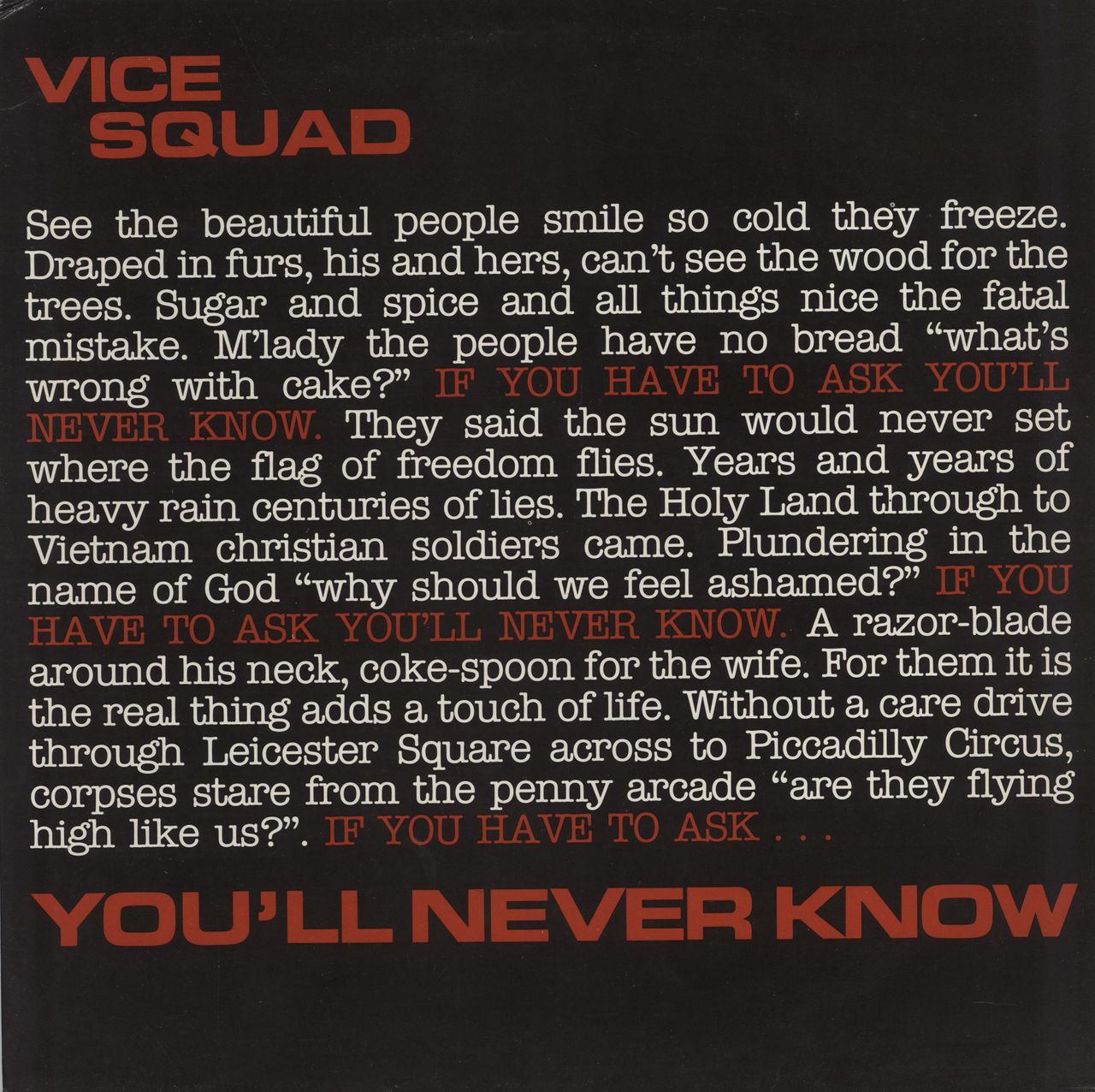 VICE SQUAD You'll Never Know (1984 UK 3-track vinyl EP, picture sleeve with lyrics on reverse. A fantastic EP by the Bristolian Punk Rockers. The sleeve has some light edge and storage wear and the vinyl is in excellent condition! 12RIOT1/2)